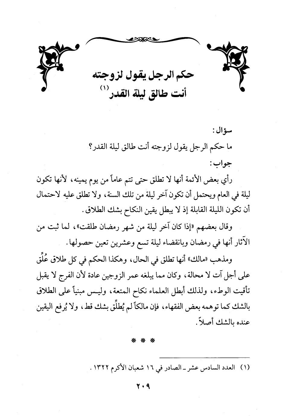 حكم الرجل يقول لزوجته أنت طالق ليلة القدر (¬1)