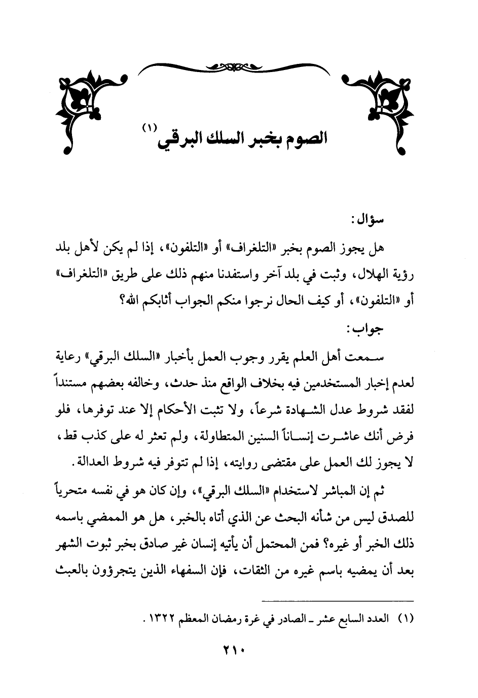 ثم إن المباشر لاستخدام "السلك البرقي"، وإن كان هو في نفسه متحرياً للصدق ليس من شأنه البحث عن الذي أتاه بالخبر، هل هو الممضي باسمه ذلك الخبر أو غيره؟ فمن المحتمل أن يأتيه إنسان غير صادق بخبر ثبوت الشهر بعد أن يمضيه باسم غيره من الثقات، فإن السفهاء الذين يتجرؤون بالعبث