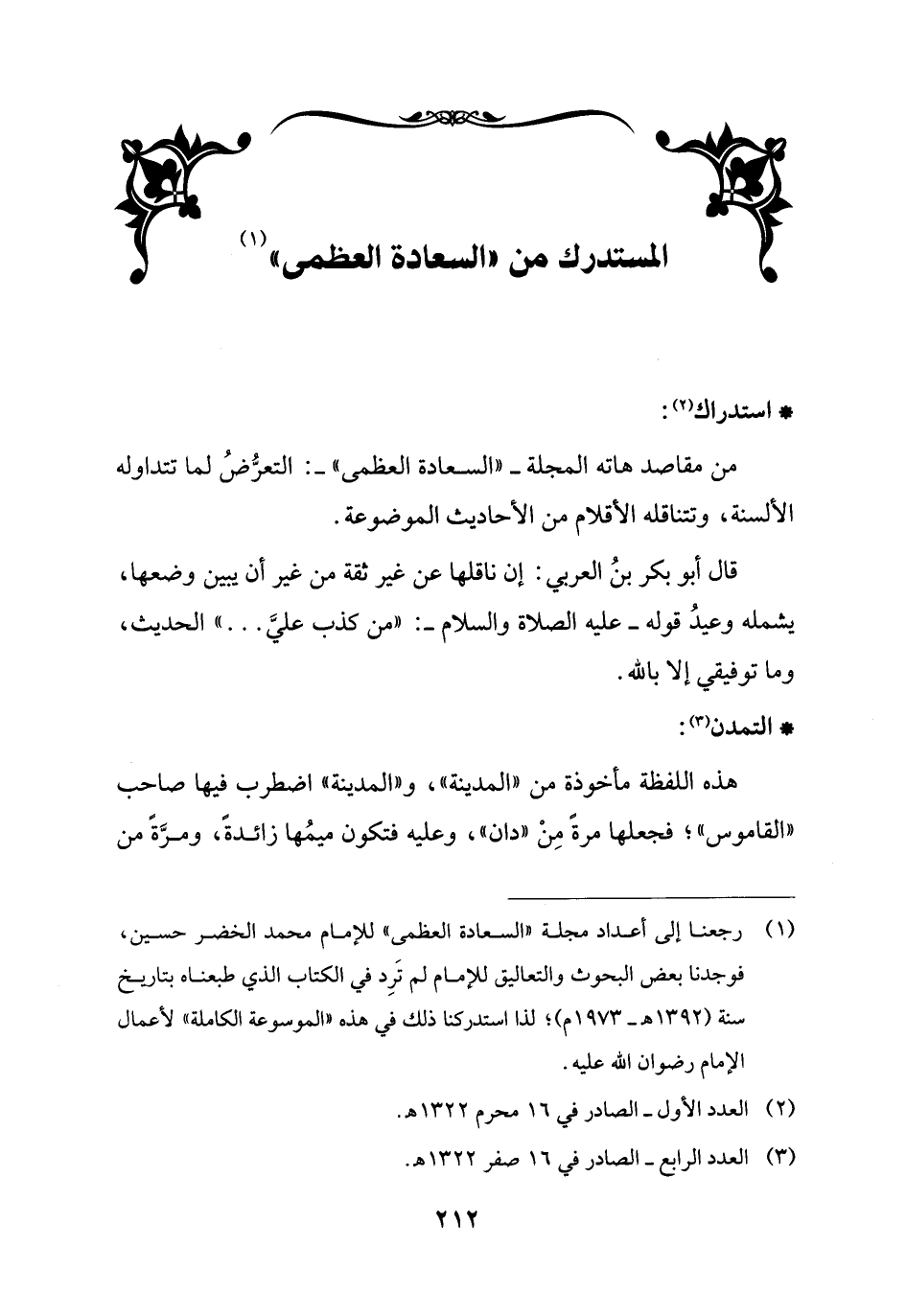 (¬1) رجعنا إلى أعداد مجلة "السعادة العظمى" للإمام محمد الخضر حسين، فوجدنا بعض البحوث والتعاليق للإمام لم تَرِد في الكتاب الذي طبعناه بتاريخ سنة (1392 هـ - 1973 م)؛ لذا استدركنا ذلك في هذه "الموسوعة الكاملة" لأعمال الإِمام - رضوان الله عليه -.