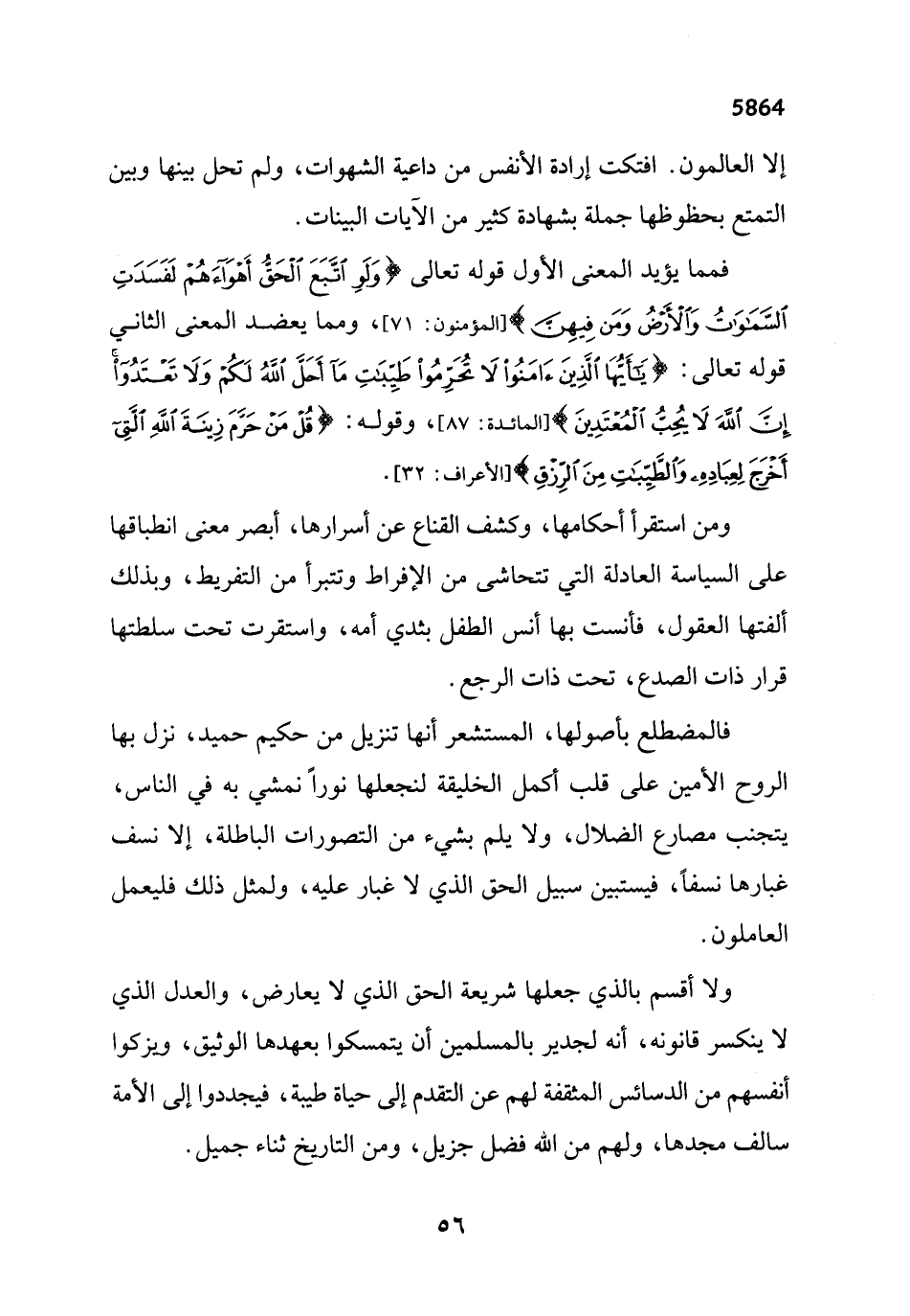 ولا أقسم بالذي جعلها شريعة الحق الذي لا يعارض، والعدل الذي لا ينكسر قانونه، أنه لجدير بالمسلمين أن يتمسكوا بعهدها الوثيق، ويزكوا أنفسهم من الدسائس المثقفة لهم عن التقدم إلى حياة طيبة، فيجددوا إلى الأمة سالف مجدها، ولهم من الله فضل جزيل، ومن التاريخ ثناء جميل.