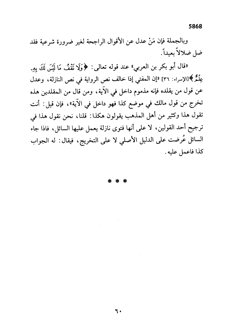 "قال أبو بكر بن العربي" عند قوله تعالى: {وَلَا تَقْفُ مَا لَيْسَ لَكَ بِهِ عِلْمٌ} [الإسراء: 36] "إن المفتي إذا خالف نص الرواية في نص النازلة، وعدل عن قول من يقلده فإنه مذموم داخل في الآية، ومن قال من المقلدين هذه تخرج من قول مالك في موضع كذا فهو داخل في الآية"، فإن قيل: أنت تقول هذا وكثير من أهل المذهب يقولون هكذا: قلنا، نحن نقول هذا في ترجيح أحد القولين، لا على أنها فتوى نازلة يعمل عليها السائل، فاذا جاء السائل عُرضت على الدليل الأصلي لا على التخريج، فيقال: له الجواب كذا فاعمل عليه.