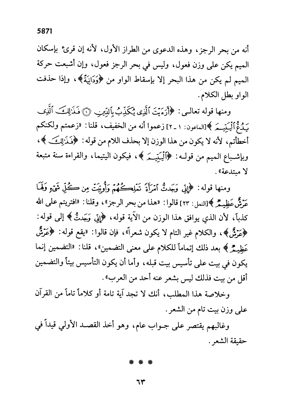 ومنها قوله تعالى: {أَرَأَيْتَ الَّذِي يُكَذِّبُ بِالدِّينِ (1) فَذَلِكَ الَّذِي يَدُعُّ الْيَتِيمَ} [الماعون: 1 - 2] زعموا أنه من الخفيف، قلنا: "زعمتم ولكنكم أخطأتم، لأنه لا يكون من هذا الوزن إلا بحذف اللام من قوله: {فَذَلِكَ]، وبإشباع الميم من قوله: {الْيَتِيمَ]، فيكون اليتيما، والقراءة سنة متبعة لا مبتدعة".