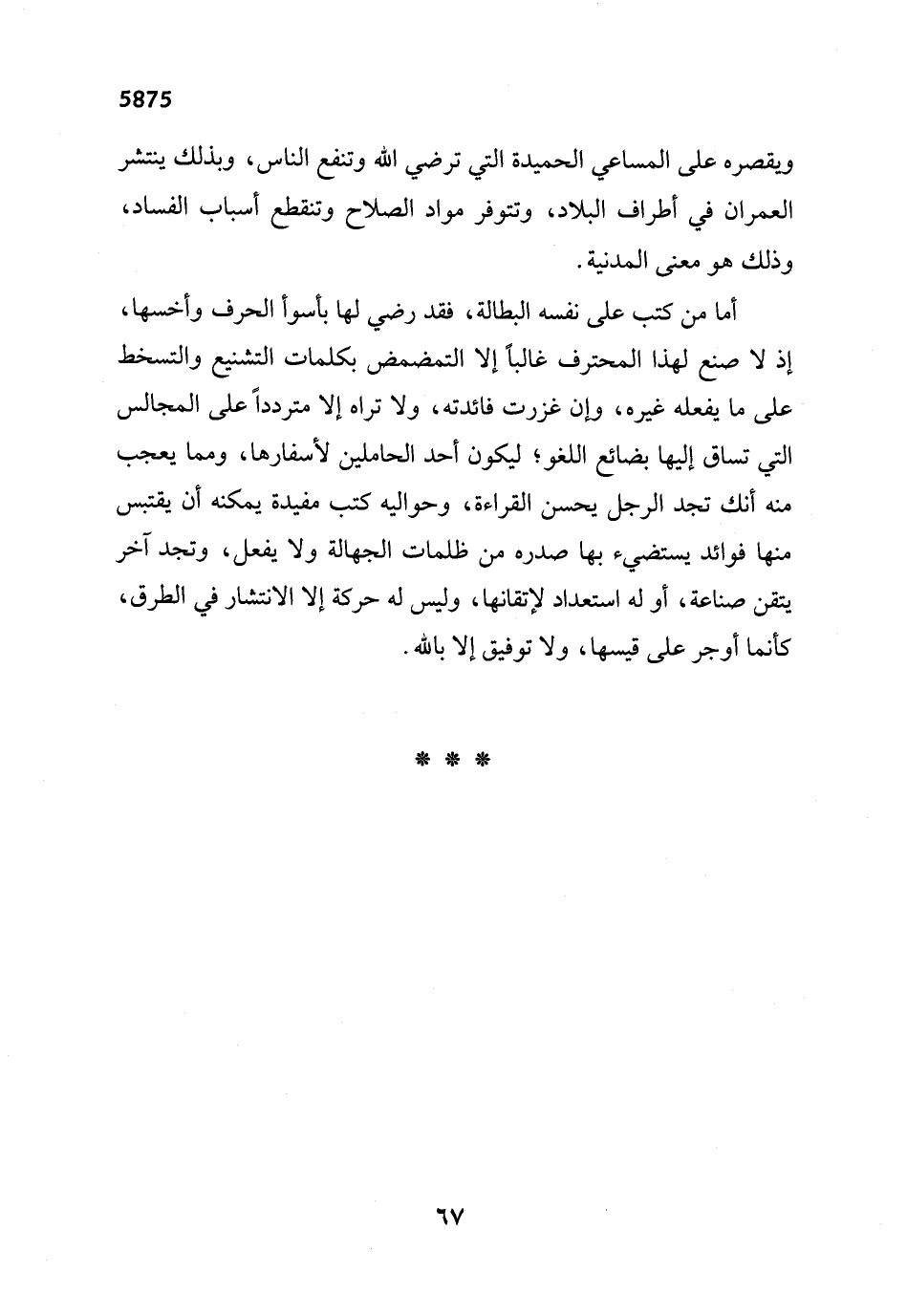 أما من كتب على نفسه البطالة، فقد رضي لها بأسوأ الحرف وأخسها، إذ لا صنع لهذا المحترف غالباً إلا التمضمض بكلمات التشنيع والتسخط على ما يفعله غيره، وإن غزرت فائدته، ولا تراه إلا متردداً على المجالس التي تساق إليها بضائع اللغو؛ ليكون أحد الحاملين لأسفارها، ومما يعجب منه أنك تجد الرجل يحسن القراءة، وحواليه كتب مفيدة يمكنه أن يقتبس منها فوائد يستضيء بها صدره من ظلمات الجهالة ولا يفعل، وتجد آخر يتقن صناعة، أو له استعداد لإتقانها، وليس له حركة إلا الانتشار في الطرق، كأنما أوجر على قيسها، ولا توفيق إلا بالله.