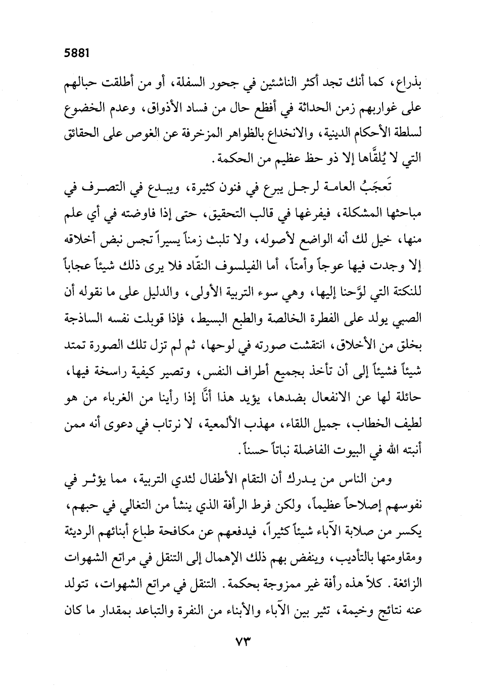 تَعجَبُ العامة لرجل يبرع في فنون كثيرة، ويبدع في التصرف في مباحثها المشكلة، فيفرغها في قالب التحقيق، حتى إذا فاوضته في أي علم منها، خيل لك أنه الواضع لأصوله، ولا تلبث زمناً يسيراً تجس نبض أخلاقه إلا وجدت فيها عوجاً وأمتاً، أما الفيلسوف النقّاد فلا يرى ذلك شيئاً عجاباً للنكتة التي لوَّحنا إليها، وهي سوء التربية الأولى، والدليل على ما نقوله أن الصبي يولد على الفطرة الخالصة والطبع البسيط، فإذا قوبلت نفسه الساذجة بخلق من الأخلاق، انتقشت صورته في لوحها، ثم لم تزل تلك الصورة تمتد شيئاً فشيئاً إلى أن تأخذ بجميع أطراف النفس، وتصير كيفية راسخة فيها، حائلة لها عن الانفعال بضدها، يؤيد هذا أنَّا إذا رأينا من الغرباء من هو لطيف الخطاب، جميل اللقاء، مهذب الألمعية، لا نرتاب في دعوى أنه ممن أنبته الله في البيوت الفاضلة نباتاً حسناً.