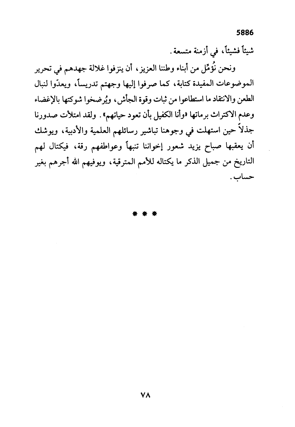 ونحن نُؤمِّل من أبناء وطننا العزيز، أن ينزفوا غلالة جهدهم في تحرير الموضوعات المفيدة كتابة، كما صرفوا إليها وجهتم تدريساً، ويعدّوا لنبال الطعن والانتقاد ما استطاعوا من ثبات وقوة الجأش، وُيرضخوا شوكتها بالإغضاء وعدم الاكتراث برماتها "وأنا الكفيل بأن تعود حياتهم". ولقد امتلأت صدورنا جذلاً حين استهلت في وجوهنا تباشير رسائلهم العلمية والأدبية، ويوشك أن يعقبها صباح يزيد شعور إخواننا تنبهاً وعواطفهم رقة، فيكتال لهم التاريخ من جميل الذكر ما يكتاله للأمم المترقية، ويوفيهم الله أجرهم بغير حساب.