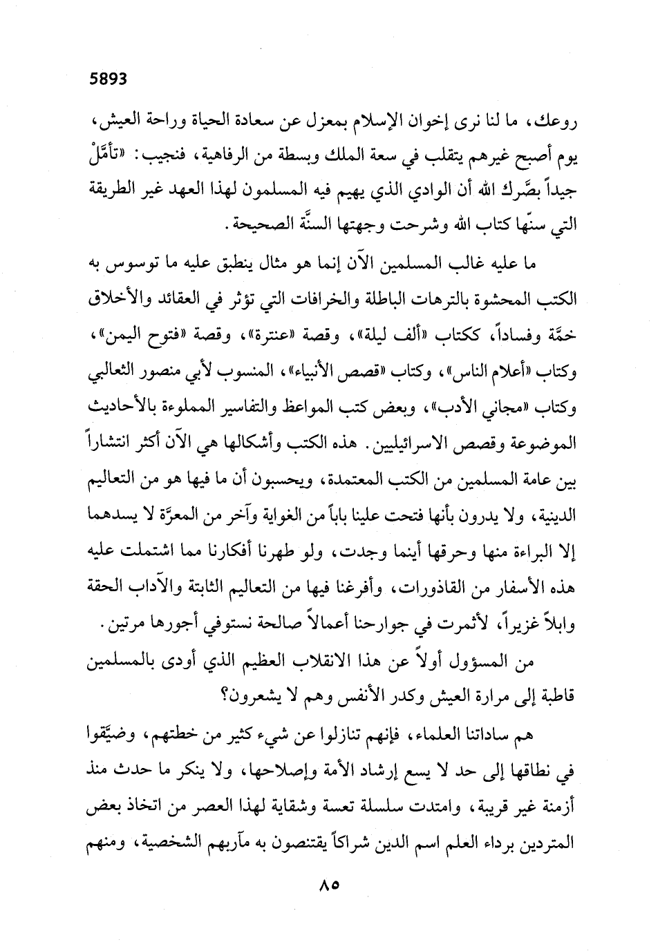 ما عليه غالب المسلمين الآن إنما هو مثال ينطبق عليه ما توسوس به الكتب المحشوة بالترهات الباطلة والخرافات التي تؤثر في العقائد والأخلاق خمَّة وفساداً، ككتاب "ألف ليلة"، وقصة "عنترة"، وقصة "فتوح اليمن"، وكتاب "أعلام الناس"، وكتاب "قصص الأنبياء"، المنسوب لأبي منصور الثعالبي وكتاب "مجاني الأدب"، وبعض كتب المواعظ والتفاسير المملوءة بالأحاديث الموضوعة وقصص الاسرائيليين. هذه الكتب وأشكالها هي الآن أكثر انتشاراً بين عامة المسلمين من الكتب المعتمدة، ويحسبون أن ما فيها هو من التعاليم الدينية، ولا يدرون بأنها فتحت علينا باباً من الغواية وآخر من المعرَّة لا يسدهما إلا البراءة منها وحرقها أينما وجدت، ولو طهرنا أفكارنا مما اشتملت عليه هذه الأسفار من القاذورات، وأفرغنا فيها من التعاليم الثابتة والآداب الحقة وابلاً غزيراً، لأثمرت في جوارحنا أعمالاً صالحة نستوفي أجورها مرتين.