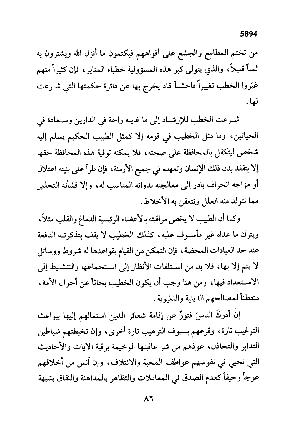 شرعت الخطب للإرشاد إلى ما غايته راحة في الدارين وسعادة في الحياتين، وما مثل الخطيب في قومه إلا كمثل الطبيب الحكيم يسلم إليه شخص ليتكفل بالمحافظة على صحته، فلا يمكنه توفية هذه المحافظة حقها إلا بتفقد بدن ذلك الإنسان وتعهده في جميع الأزمنة، فإن طرأ على بنيته اعتلال أو مزاجه انحراف بادر إلى معالجته بدوائه المناسب له، وإلا فشأنه التحذير مما تتولد منه العلل وتتعفن به الأخلاط.