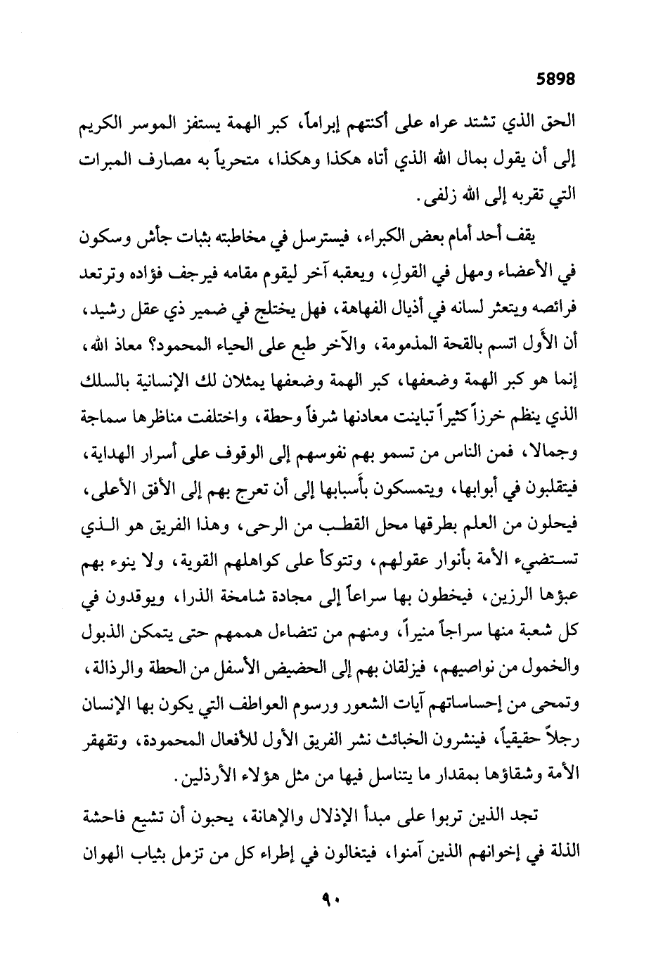 يقف أحد أمام بعض الكبراء، فيسترسل في مخاطبته بثبات جأش وسكون في الأعضاء ومهل في القولِ، ويعقبه آخر ليقوم مقامه فيرجف فؤاده وترتعد فرائصه ويتعثر لسانه في أذيال الفهاهة، فهل يختلج في ضمير ذي عقل رشيد، أن الأَول اتسم بالقحة المذمومة، والآخر طبع على الحياء المحمود؟ معاذ الله، إنما هو كبر الهمة وضعفها، كبر الهمة وضعفها يمثلان لك الإنسانية بالسلك الذي ينظم خرزاً كثيراً تباينت معادنها شرفاً وحطة، واختلفت مناظرها سماجة وجمالا، فمن الناس من تسمو بهم نفوسهم إلى الوقوف على أسرار الهداية، فيتقلبون في أبوابها، ويتمسكون بأسبابها إلى أن تعرج بهم إلى الأفق الأعلى، فيحلون من العلم بطرقها محل القطب من الرحى، وهذا الفريق هو الذي تستضيء الأمة بانوار عقولهم، وتتوكأ على كواهلهم القوية، ولا ينوء بهم عبؤها الرزين، فيخطون بها سراعاً إلى مجادة شامخة الذرا، ويوقدون في كل شعبة منها سراجاً منيراً، ومنهم من تتضاءل هممهم حتى يتمكن الذبول والخمول من نواصيهم، فيزلقان بهم إلى الحضيض الأسفل من الحطة والرذالة، وتمحى من إحساساتهم آيات الشعور ورسوم العواطف التي يكون بها الإنسان رجلاً حقيقياً، فينشرون الخبائث نشر الفريق الأول للأفعال المحمودة، وتقهقر الأمة وشقاؤها بمقدار ما يتناسل فيها من مثل هؤلاء الأرذلين.