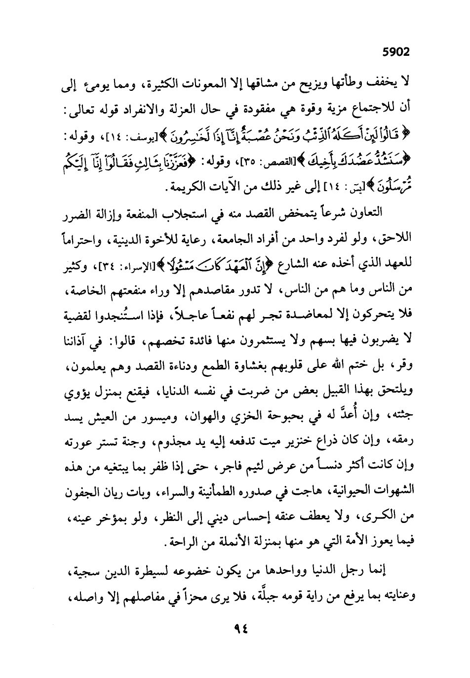 لا يخفف وطأتها ويزيح من مشاقها إلا المعونات الكثيرة، ومما يومئ إلى أن للاجتماع مزية وقوة هي مفقودة في حال العزلة والانفراد قوله تعالى: {قَالُوا لَئِنْ أَكَلَهُ الذِّئْبُ وَنَحْنُ عُصْبَةٌ إِنَّا إِذًا لَخَاسِرُونَ} [يوسف: 14] وقوله: {سَنَشُدُّ عَضُدَكَ بِأَخِيكَ} [القصص: 35]، وقوله: {فَعَزَّزْنَا بِثَالِثٍ فَقَالُوا إِنَّا إِلَيْكُمْ مُرْسَلُونَ} [يس: 14] إلى غير ذلك من الآيات الكريمة.