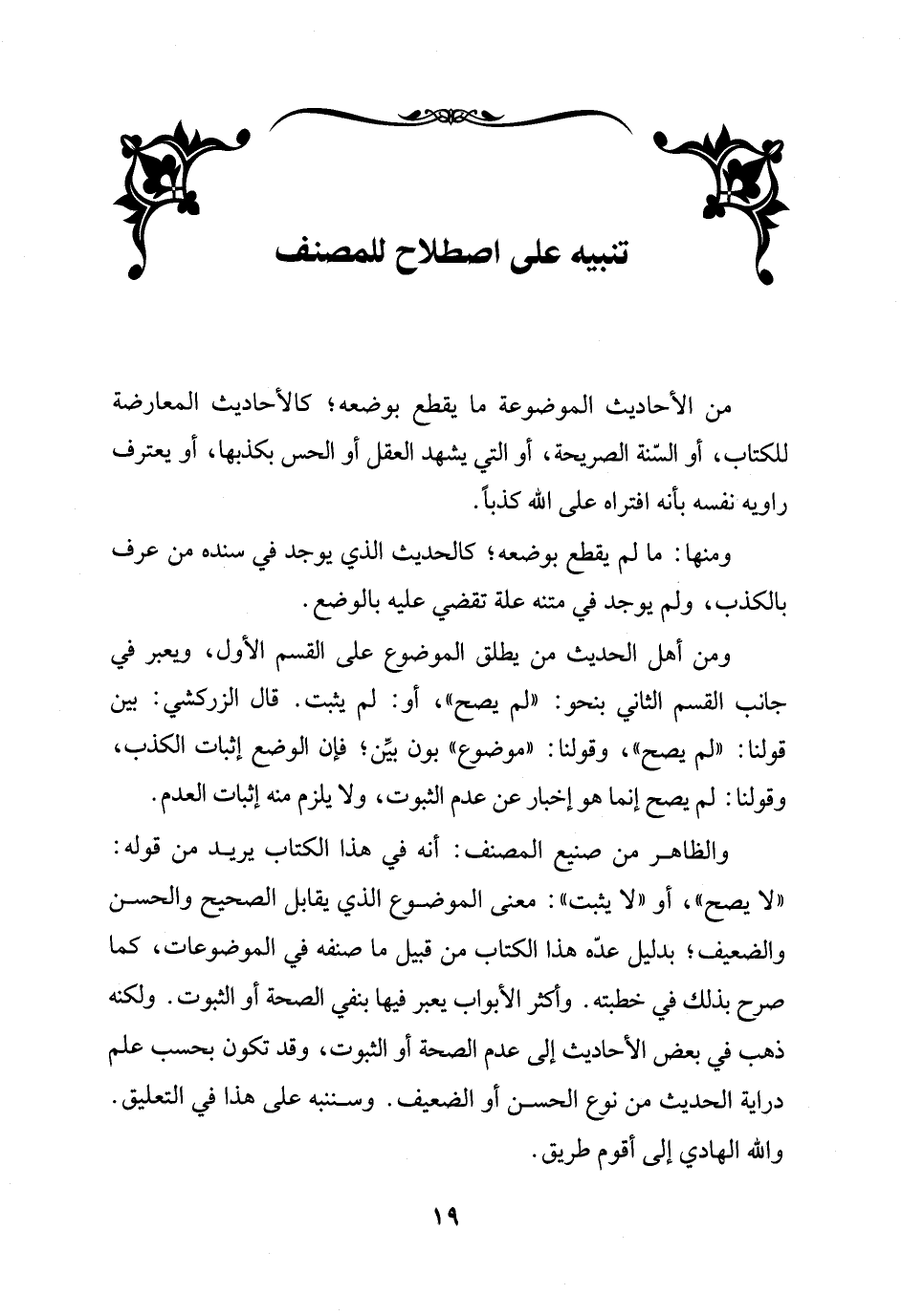 والظاهر من صنيع المصنف: أنه في هذا الكتاب يريد من قوله: "لا يصح"، أو "لا يثبت": معنى الموضوع الذي يقابل الصحيح والحسن والضعيف؛ بدليل عدّه هذا الكتاب من قبيل ما صنفه في الموضوعات، كما صرح بذلك في خطبته. وأكثر الأبواب يعبر فيها بنفي الصحة أو الثبوت. ولكنه ذهب في بعض الأحاديث إلى عدم الصحة أو الثبوت، وقد تكون بحسب علم دراية الحديث من نوع الحسن أو الضعيف. وسننبه على هذا في التعليق. والله الهادي إلى أقوم طريق.