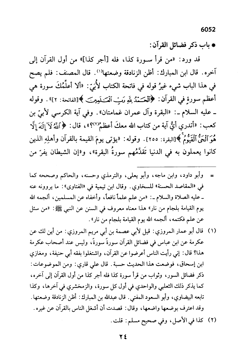 (¬1) قال أبو عمار المروزي: قيل لأبي عصمة بن أبي مريم المروزي: من أين لك عن عكرمة عن ابن عباس في فضائل القرآن سورةً سورةً، وليس عند أصحاب عكرمة هذا؟ قال: إني رأيت الناس أعرضوا غن القرآن، واشتغلوا بفقه أبي حنيفة، ومغازي ابن إسحاق، فوضعت هذا الحديث حسبة. قال علي قاري: ومن الموضوعات: ذكر فضائل السور، وثواب من قرأ سورة كذا فله أجر كذا من أول القرآن إلى آخره، كما يذكر ذلك الثعلبي والواحدي في أول كل سورة، والزمخشري في آخرها، وكذا تابعه البيضاوي، وأبو السعود المفتي. قال عبد الله بن المبارك: أظن الزنادقة وضعتها. وقد اعترف بوضعها واضعها، وقال: قصدت أن أشغل الناس بالقرآن عن غيره.