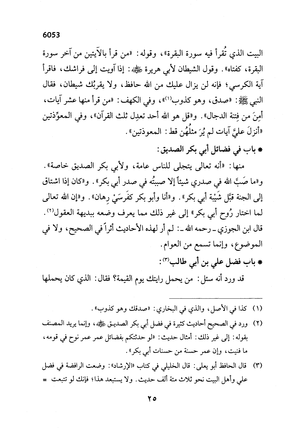 منها: "أنه تعالى يتجلى للناس عامة، ولأبي بكر الصديق خاصة". و"ما صَبَّ الله في صدري شيئاً إلا صببتُه في صدر أبي بكر". و"كان إذا اشتاق إلى الجنة قبَّل شَيْبة أبي بكر". و"أنا وأبو بكر كفَرسَيْ رِهان". و"إن الله تعالى لما اختار رُوح أبي بكر" إلى غير ذلك مما يعرف وضعه ببديهة العقول (¬2). قال ابن الجوزي -رحمه الله-: لم أر لهذه الأحاديث أثراً في الصحيح، ولا في الموضوع، وإنما تسمع من العوام.