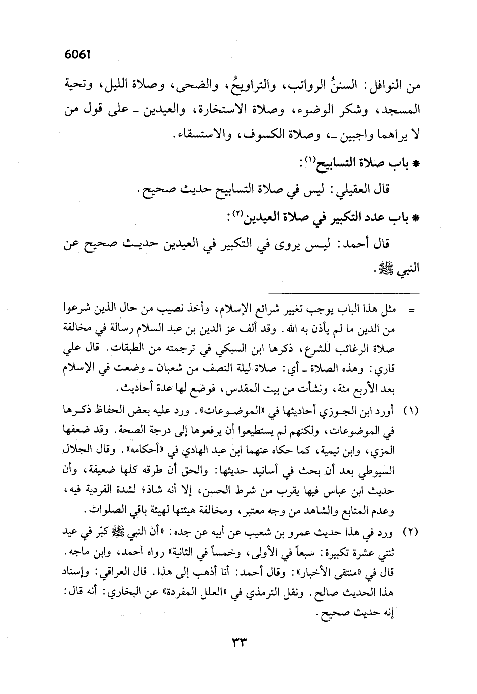 (¬2) ورد في هذا حديث عمرو بن شعيب عن أبيه عن جده: "أن النبي - صلى الله عليه وسلم - كبّر في عيد ثنتي عشرة تكبيرة: سبعاً في الأولى، وخمساً في الثانية" رواه أحمد، وابن ماجه. قال في "منتقى الأخبار": وقال أحمد: أنا أذهب إلى هذا. قال العراقي: وإسناد هذا الحديث صالح. ونقل الترمذي في "العلل المفردة" عن البخاري: أنه قال: إنه حديث صحيح.