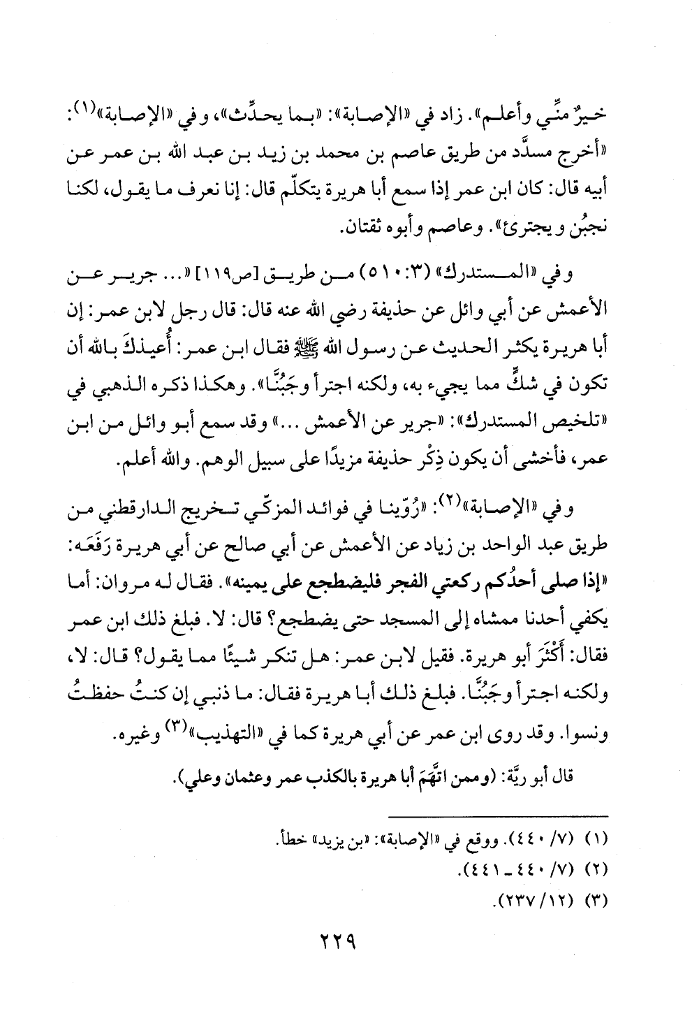 وفي «الإصابة» (¬٢): «رُوّينا في فوائد المزكّي تخريج الدارقطني من طريق عبد الواحد بن زياد عن الأعمش عن أبي صالح عن أبي هريرة رَفَعَه: «إذا صلى أحدُكم ركعتي الفجر فليضطجع على يمينه». فقال له مروان: أما يكفي أحدنا ممشاه إلى المسجد حتى يضطجع؟ قال: لا. فبلغ ذلك ابن عمر فقال: أَكْثَرَ أبو هريرة. فقيل لابن عمر: هل تنكر شيئًا مما يقول؟ قال: لا، ولكنه اجترأ وجَبُنَّا. فبلغ ذلك أبا هريرة فقال: ما ذنبي إن كنتُ حفظتُ ونسوا. وقد روى ابن عمر عن أبي هريرة كما في «التهذيب» (¬٣) وغيره.