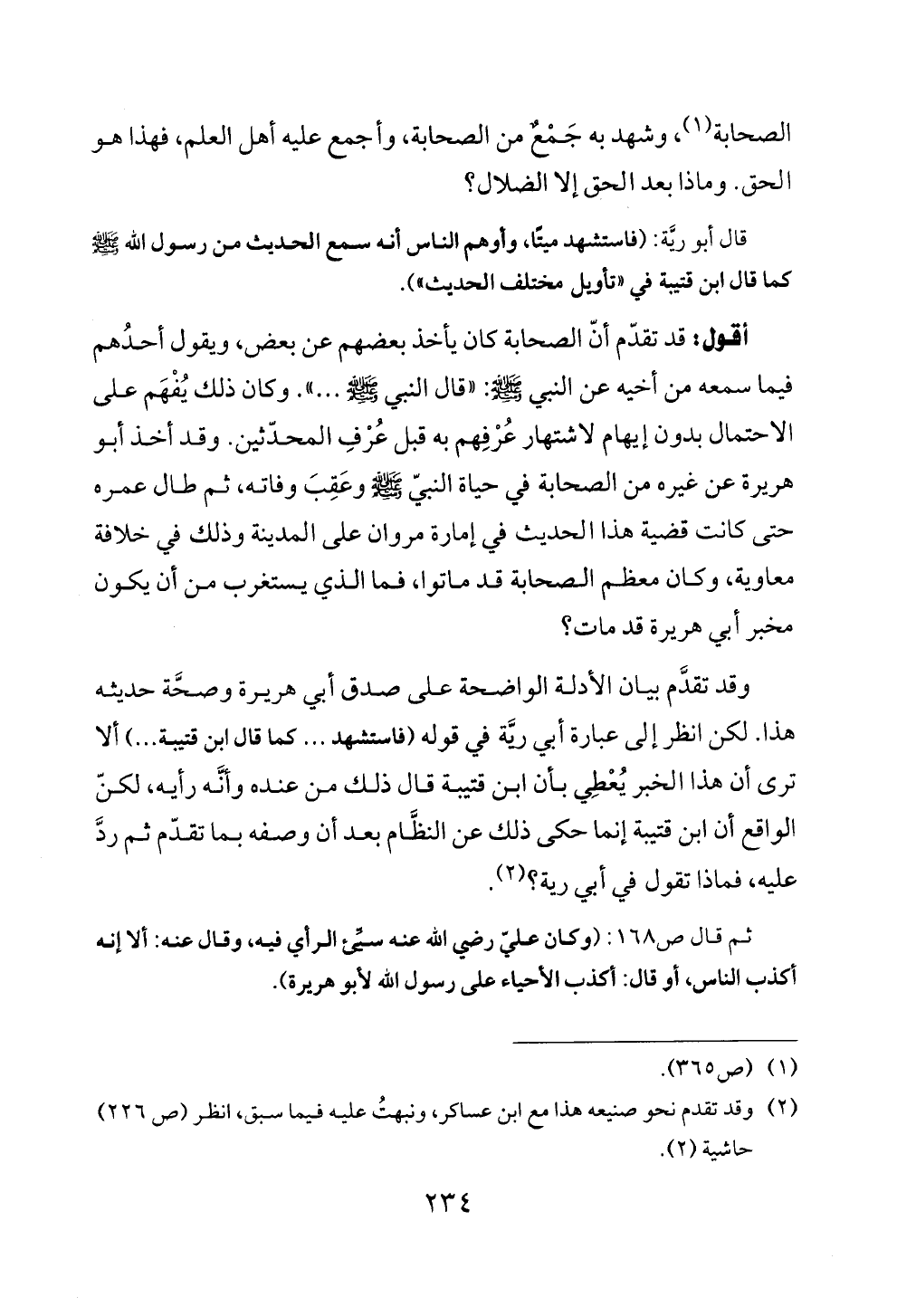 وقد تقدَّم بيان الأدلة الواضحة على صدق أبي هريرة وصحَّة حديثه هذا. لكن انظر إلى عبارة أبي ريَّة في قوله (فاستشهد ... كما قال ابن قتيبة ... ) ألا ترى أن هذا الخبر يُعْطِي بأن ابن قتيبة قال ذلك من عنده وأنَّه رأيه، لكنّ الواقع أن ابن قتيبة إنما حكى ذلك عن النظَّام بعد أن وصفه بما تقدّم ثم ردَّ عليه، فماذا تقول في أبي رية؟ (¬٢).