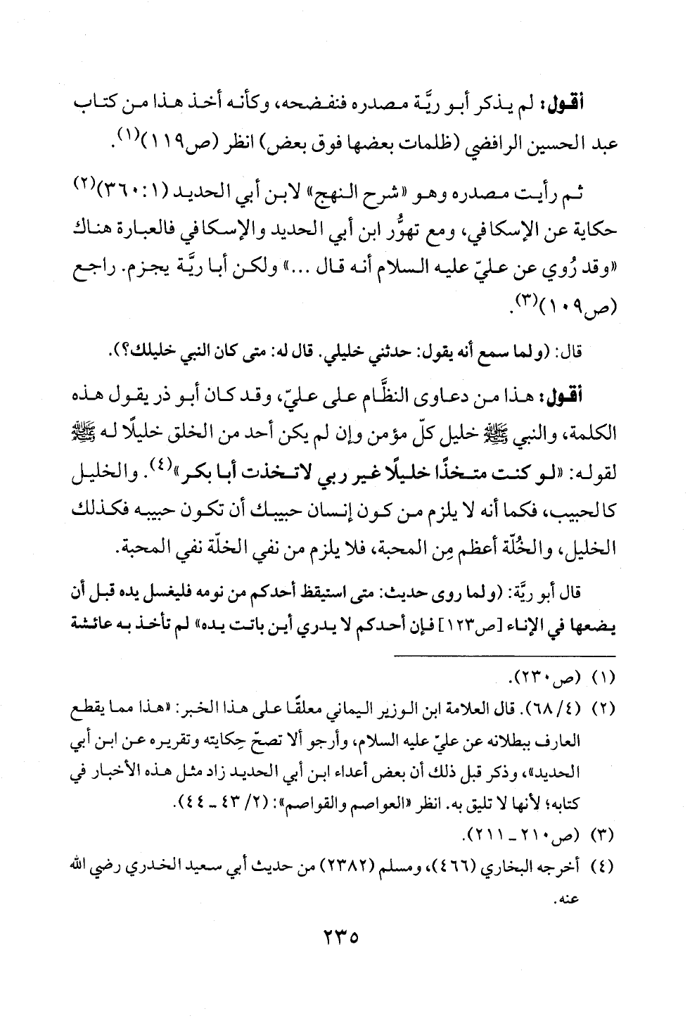 أقول: لم يذكر أبو ريَّة مصدره فنفضحه، وكأنه أخذ هذا من كتاب عبد الحسين الرافضي (ظلمات بعضها فوق بعض) انظر (ص ١١٩) (¬١).