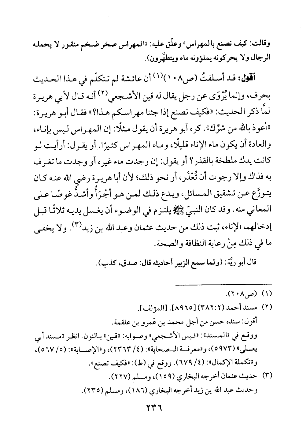 وقالت: كيف نصنع بالمهراس» وعلّق عليه: «المهراس صخر ضخم منقور لا يحمله الرجال ولا يحركونه يملؤونه ماء ويتطهَّرون).