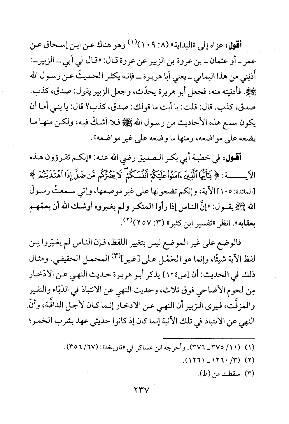 أقول: عزاه إلى «البداية» (٨: ١٠٩) (¬١) وهو هناك عن ابن إسحاق عن عمر ــ أو عثمان ــ بن عروة بن الزبير عن عروة قال: «قال لي أبي ــ الزبيرـ: أَدْنِني من هذا اليماني ــ يعني أبا هريرة ــ فإنه يكثر الحديثَ عن رسول الله - صلى الله عليه وسلم -. فأدنيته منه، فجعل أبو هريرة يحدّث، وجعل الزبير يقول: صدق، كذب. صدق، كذب. قال: قلت: يا أبت ما قولك: صدق، كذب؟ قال: يا بني أما أن يكون سمع هذه الأحاديث من رسول الله - صلى الله عليه وسلم - فلا أشكّ فيه، ولكن منها ما يضعه على مواضعه، ومنها ما وضعه على غير مواضعه».