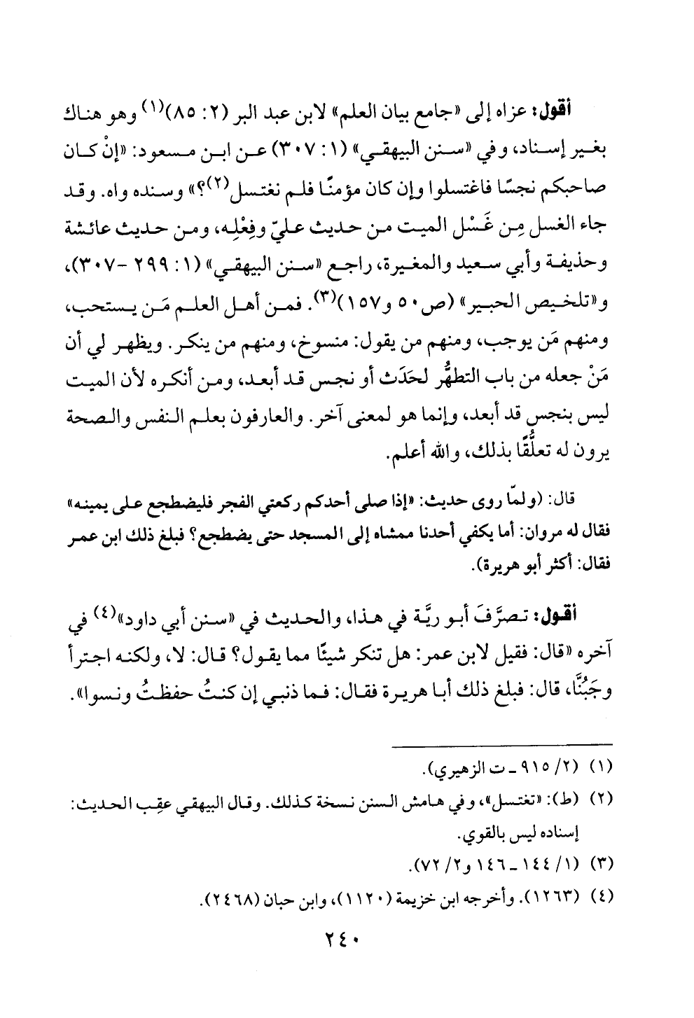 أقول: عزاه إلى «جامع بيان العلم» لابن عبد البر (٢: ٨٥) (¬١) وهو هناك بغير إسناد، وفي «سنن البيهقي» (١: ٣٠٧) عن ابن مسعود: «إنْ كان صاحبكم نجسًا فاغتسلوا وإن كان مؤمنًا فلم نغتسل (¬٢)؟» وسنده واه. وقد جاء الغسل مِن غَسْل الميت من حديث عليّ وفِعْلِه، ومن حديث عائشة وحذيفة وأبي سعيد والمغيرة، راجع «سنن البيهقي» (١: ٢٩٩ - ٣٠٧)، و «تلخيص الحبير» (ص ٥٠ و ١٥٧) (¬٣). فمن أهل العلم مَن يستحب، ومنهم مَن يوجب، ومنهم من يقول: منسوخ، ومنهم من ينكر. ويظهر لي أن مَنْ جعله من باب التطهُّر لحَدَث أو نجس قد أبعد، ومن أنكره لأن الميت ليس بنجس قد أبعد، وإنما هو لمعنى آخر. والعارفون بعلم النفس والصحة يرون له تعلُّقًا بذلك، والله أعلم.