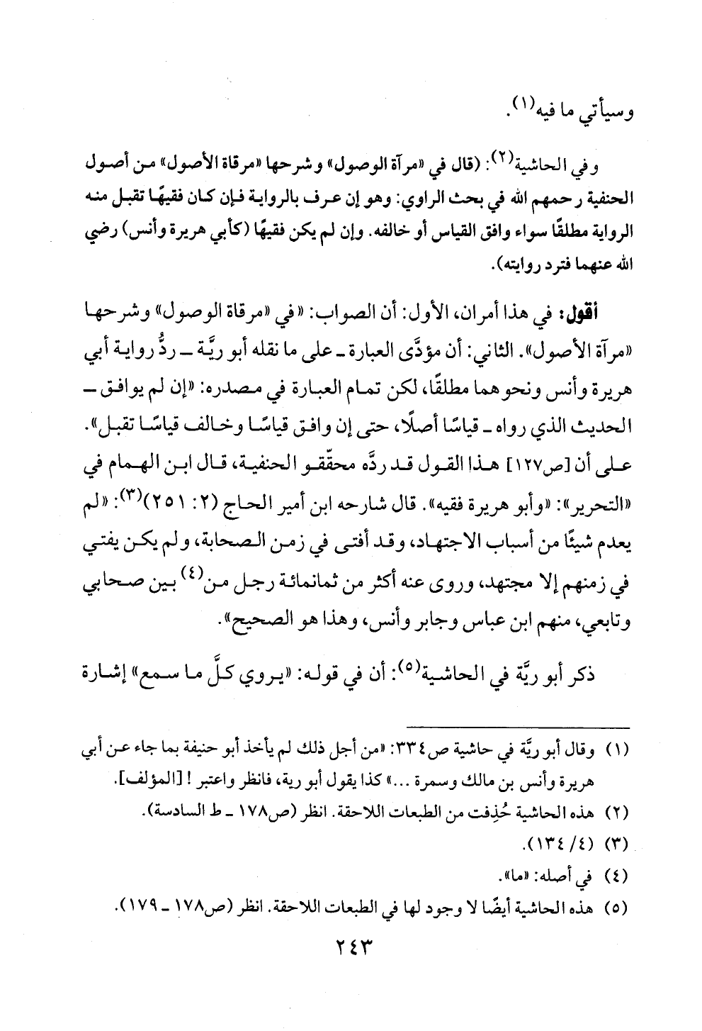 أقول: في هذا أمران، الأول: أن الصواب: «في «مرقاة الوصول» وشرحها «مرآة الأصول». الثاني: أن مؤدَّى العبارة ــ على ما نقله أبو ريَّة ــ ردُّ رواية أبي هريرة وأنس ونحوهما مطلقًا، لكن تمام العبارة في مصدره: «إن لم يوافق ــ الحديث الذي رواه ــ قياسًا أصلًا، حتى إن وافق قياسًا وخالف قياسًا تقبل». على أن [ص ١٢٧] هذا القول قد ردَّه محقّقو الحنفية، قال ابن الهمام في «التحرير»: «وأبو هريرة فقيه». قال شارحه ابن أمير الحاج (٢: ٢٥١) (¬٣): «لم يعدم شيئًا من أسباب الاجتهاد، وقد أفتى في زمن الصحابة، ولم يكن يفتي في زمنهم إلا مجتهد، وروى عنه أكثر من ثمانمائة رجل من (¬٤) بين صحابي وتابعي، منهم ابن عباس وجابر وأنس، وهذا هو الصحيح».
