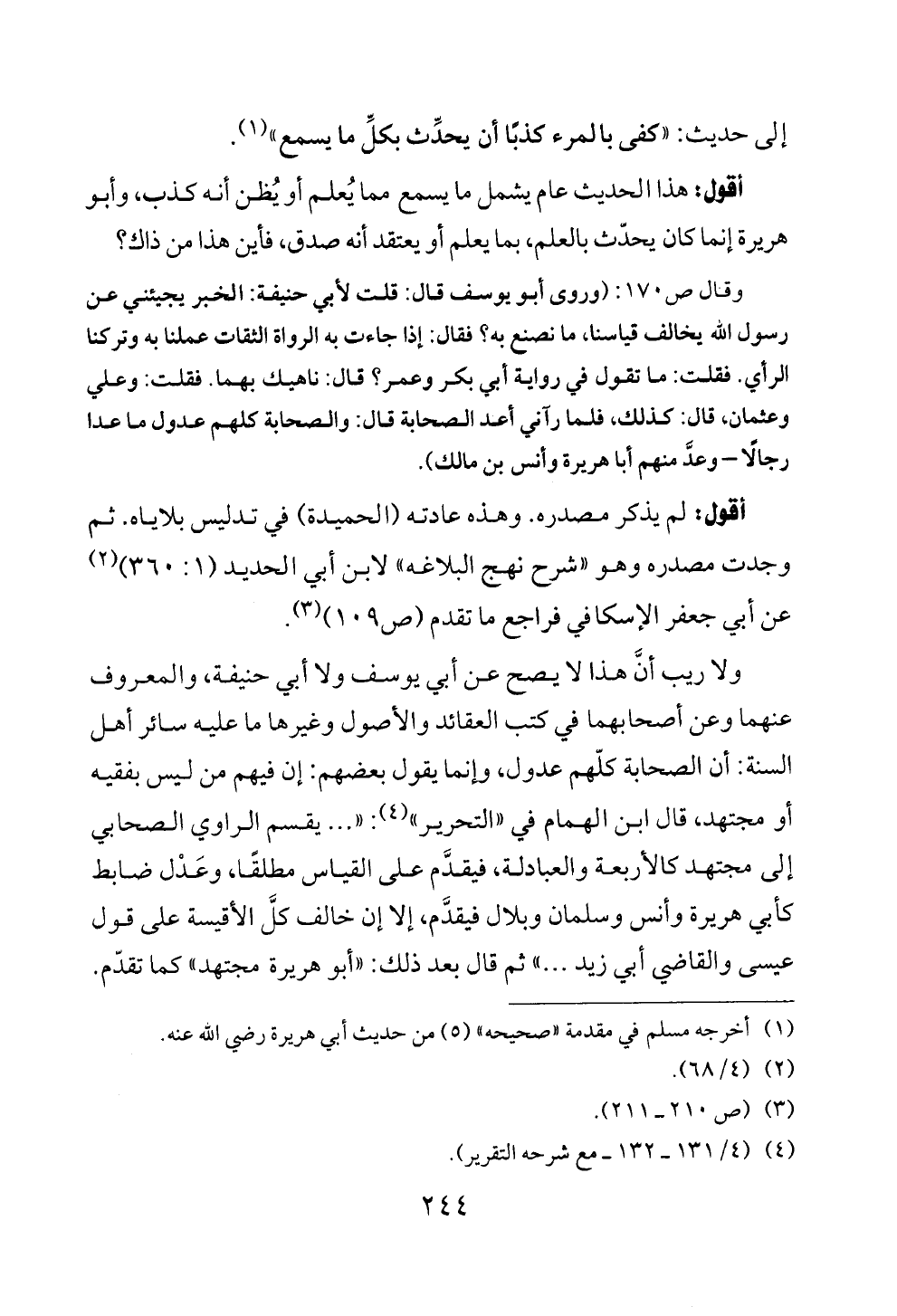 ولا ريب أنَّ هذا لا يصح عن أبي يوسف ولا أبي حنيفة، والمعروف عنهما وعن أصحابهما في كتب العقائد والأصول وغيرها ما عليه سائر أهل السنة: أن الصحابة كلّهم عدول، وإنما يقول بعضهم: إن فيهم من ليس بفقيه أو مجتهد، قال ابن الهمام في «التحرير» (¬٤): « ... يقسم الراوي الصحابي إلى مجتهد كالأربعة والعبادلة، فيقدَّم على القياس مطلقًا، وعَدْل ضابط كأبي هريرة وأنس وسلمان وبلال فيقدَّم، إلا إن خالف كلَّ الأقيسة على قول عيسى والقاضي أبي زيد ... » ثم قال بعد ذلك: «أبو هريرة مجتهد» كما تقدّم.