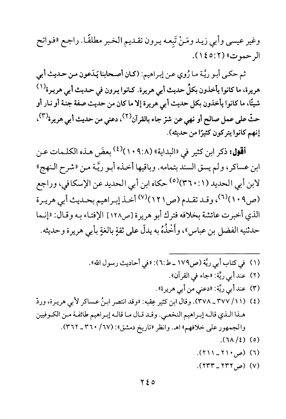 أقول: ذكر ابن كثير في «البداية» (١٠٩: ٨) (¬٤) بعضَ هذه الكلمات عن ابن عساكر، ولم يسق السند بتمامه. وباقيها أخذه أبو ريَّة من «شرح النهج» لابن أبي الحديد (٣٦٠: ١) (¬٥) حكاه ابن أبي الحديد عن الإسكافي، وراجع (ص ١٠٩) (¬٦)، وقد تقدم (ص ١٢١) (¬٧) أخذ إبراهيم بحديث أبي هريرة الذي أخبرت عائشة بخلافه فترك أبو هريرة [ص ١٢٨] الإفتاء به وقال: «إنما حدثنيه الفضل بن عباس»، وأَخْذُهُ به يدلّ على ثقةٍ بالغةٍ بأبي هريرة وحديثه.