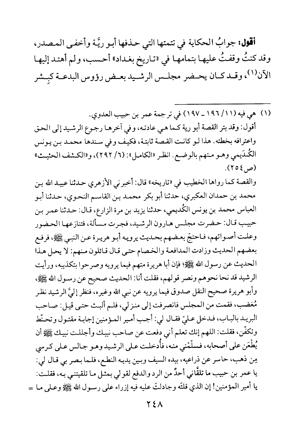أقول: وقد بتر القصة أبو رية كما هي عادته، وفي آخرها رجوع الرشيد إلى الحق واعترافه بخطئه. هذا لو كانت القصة ثابتة، فكيف وفي سندها محمد بن يونس الكُدَيمي وهو متهم بالوضع. انظر «الكامل»: (٦/ ٢٩٢)، و «الكشف الحثيث» (ص ٢٥٤).