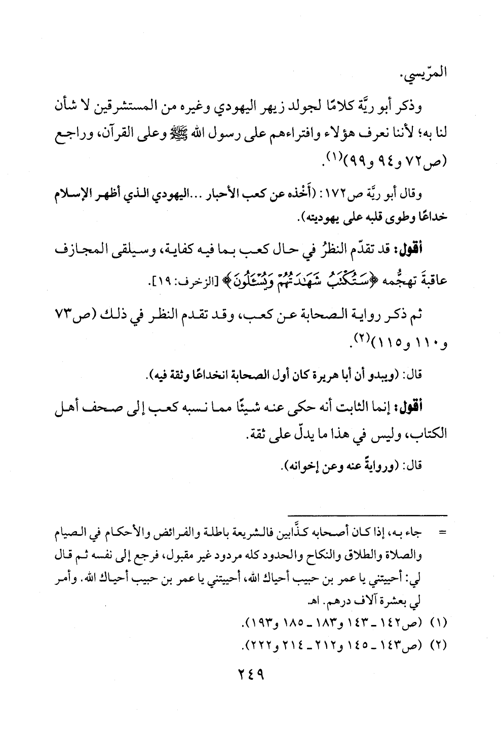 وذكر أبو ريَّة كلامًا لجولد زيهر اليهودي وغيره من المستشرقين لا شأن لنا به؛ لأننا نعرف هؤلاء وافتراءهم على رسول الله - صلى الله عليه وسلم - وعلى القرآن، وراجع (ص ٧٢ و ٩٤ و ٩٩) (¬١).