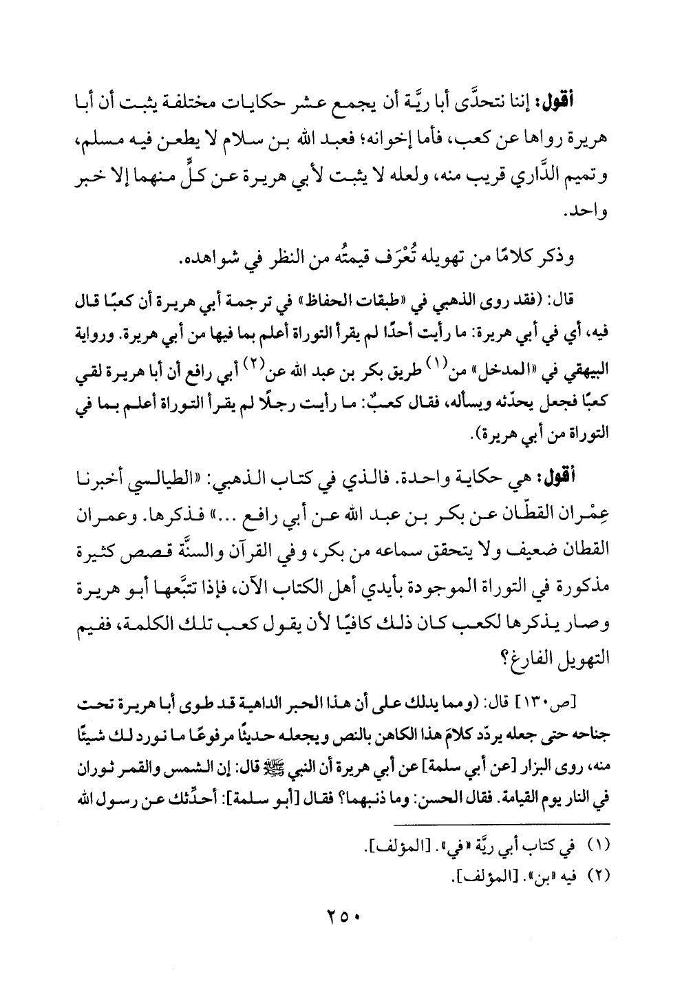 [ص ١٣٠] قال: (ومما يدلك على أن هذا الحبر الداهية قد طوى أبا هريرة تحت جناحه حتى جعله يردّد كلامَ هذا الكاهن بالنص ويجعله حديثًا مرفوعًا ما نورد لك شيئًا منه، روى البزار [عن أبي سلمة] عن أبي هريرة أن النبي - صلى الله عليه وسلم - قال: إن الشمس والقمر ثوران في النار يوم القيامة. فقال الحسن: وما ذنبهما؟ فقال [أبو سلمة]: أحدِّثك عن رسول الله