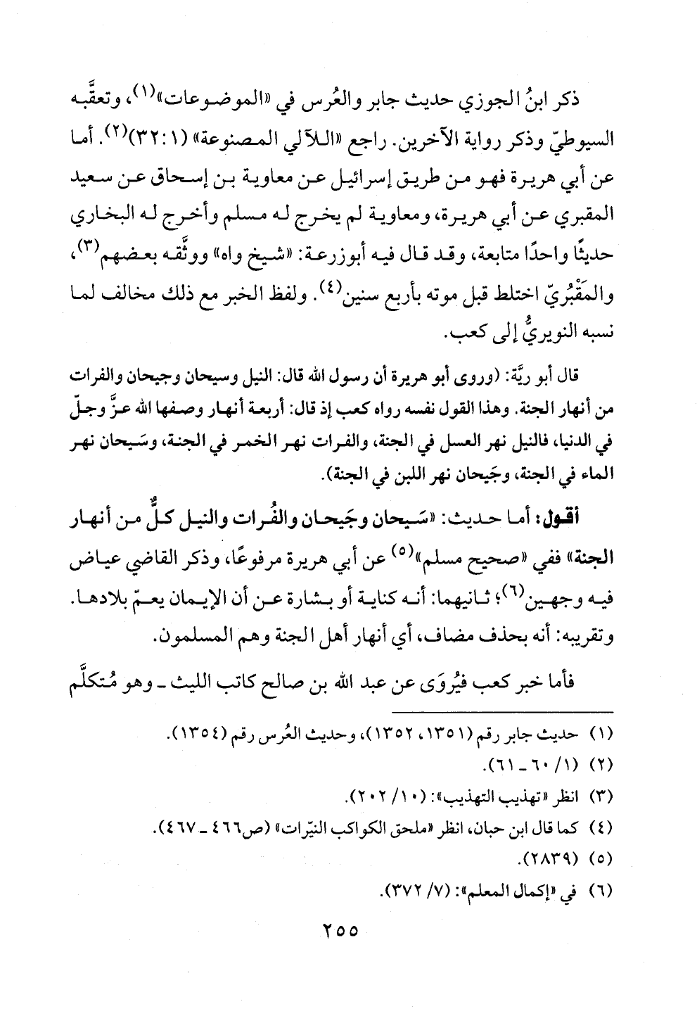 أقول: أما حديث: «سَيحان وجَيحان والفُرات والنيل كلٌّ من أنهار الجنة» ففي «صحيح مسلم» (¬٥) عن أبي هريرة مرفوعًا، وذكر القاضي عياض فيه وجهين (¬٦)؛ ثانيهما: أنه كناية أو بشارة عن أن الإيمان يعمّ بلادها. وتقريبه: أنه بحذف مضاف، أي أنهار أهل الجنة وهم المسلمون.