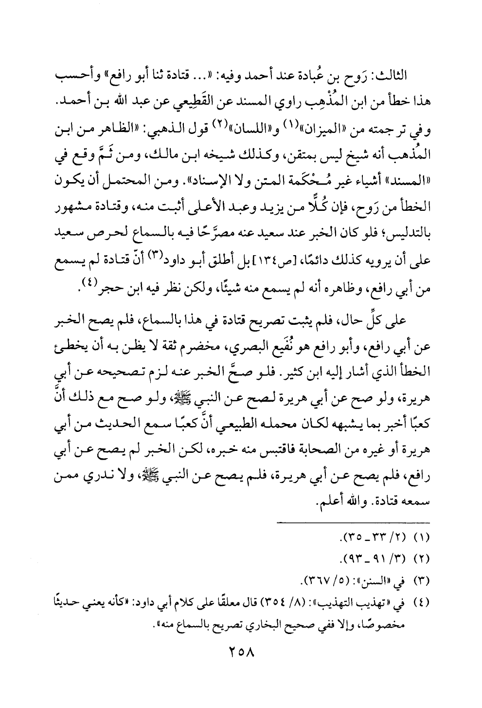 الثالث: رَوح بن عُبادة عند أحمد وفيه: « ... قتادة ثنا أبو رافع» وأحسب هذا خطأ من ابن المُذْهِب راوي المسند عن القَطِيعي عن عبد الله بن أحمد. وفي ترجمته من «الميزان» (¬١) و «اللسان» (¬٢) قول الذهبي: «الظاهر من ابن المُذهب أنه شيخ ليس بمتقن، وكذلك شيخه ابن مالك، ومن ثَمَّ وقع في «المسند» أشياء غير مُحْكَمة المتن ولا الإسناد». ومن المحتمل أن يكون الخطأ من رَوح، فإن كُلًّا من يزيد وعبد الأعلى أثبت منه، وقتادة مشهور بالتدليس؛ فلو كان الخبر عند سعيد عنه مصرَّحًا فيه بالسماع لحرص سعيد على أن يرويه كذلك دائمًا، [ص ١٣٤] بل أطلق أبو داود (¬٣) أنّ قتادة لم يسمع من أبي رافع، وظاهره أنه لم يسمع منه شيئًا، ولكن نظر فيه ابن حجر (¬٤).