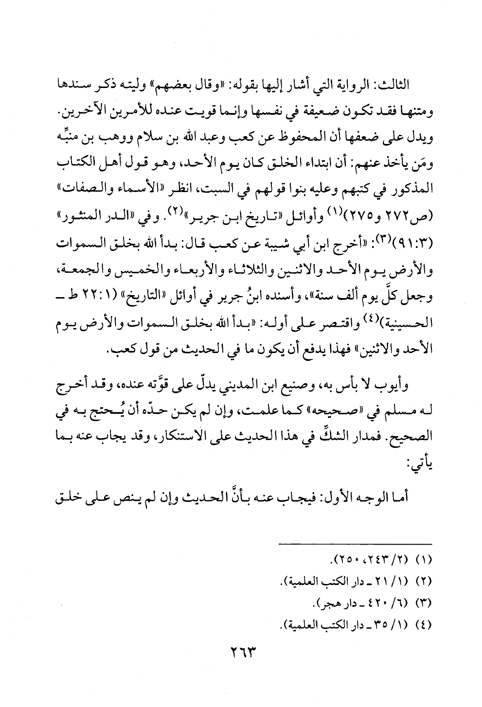 الثالث: الرواية التي أشار إليها بقوله: «وقال بعضهم» وليته ذكر سندها ومتنها فقد تكون ضعيفة في نفسها وإنما قويت عنده للأمرين الآخرين. ويدل على ضعفها أن المحفوظ عن كعب وعبد الله بن سلام ووهب بن منبِّه ومَن يأخذ عنهم: أن ابتداء الخلق كان يوم الأحد، وهو قول أهل الكتاب المذكور في كتبهم وعليه بنوا قولهم في السبت، انظر «الأسماء والصفات» (ص ٢٧٢ و ٢٧٥) (¬١) وأوائل «تاريخ ابن جرير» (¬٢). وفي «الدر المنثور» (٩١: ٣) (¬٣): «أخرج ابن أبي شيبة عن كعب قال: بدأ الله بخلق السموات والأرض يوم الأحد والاثنين والثلاثاء والأربعاء والخميس والجمعة، وجعل كلَّ يوم ألف سنة»، وأسنده ابنُ جرير في أوائل «التاريخ» (٢٢: ١ ط ــ الحسينية) (¬٤) واقتصر على أوله: «بدأ الله بخلق السموات والأرض يوم الأحد والاثنين» فهذا يدفع أن يكون ما في الحديث من قول كعب.