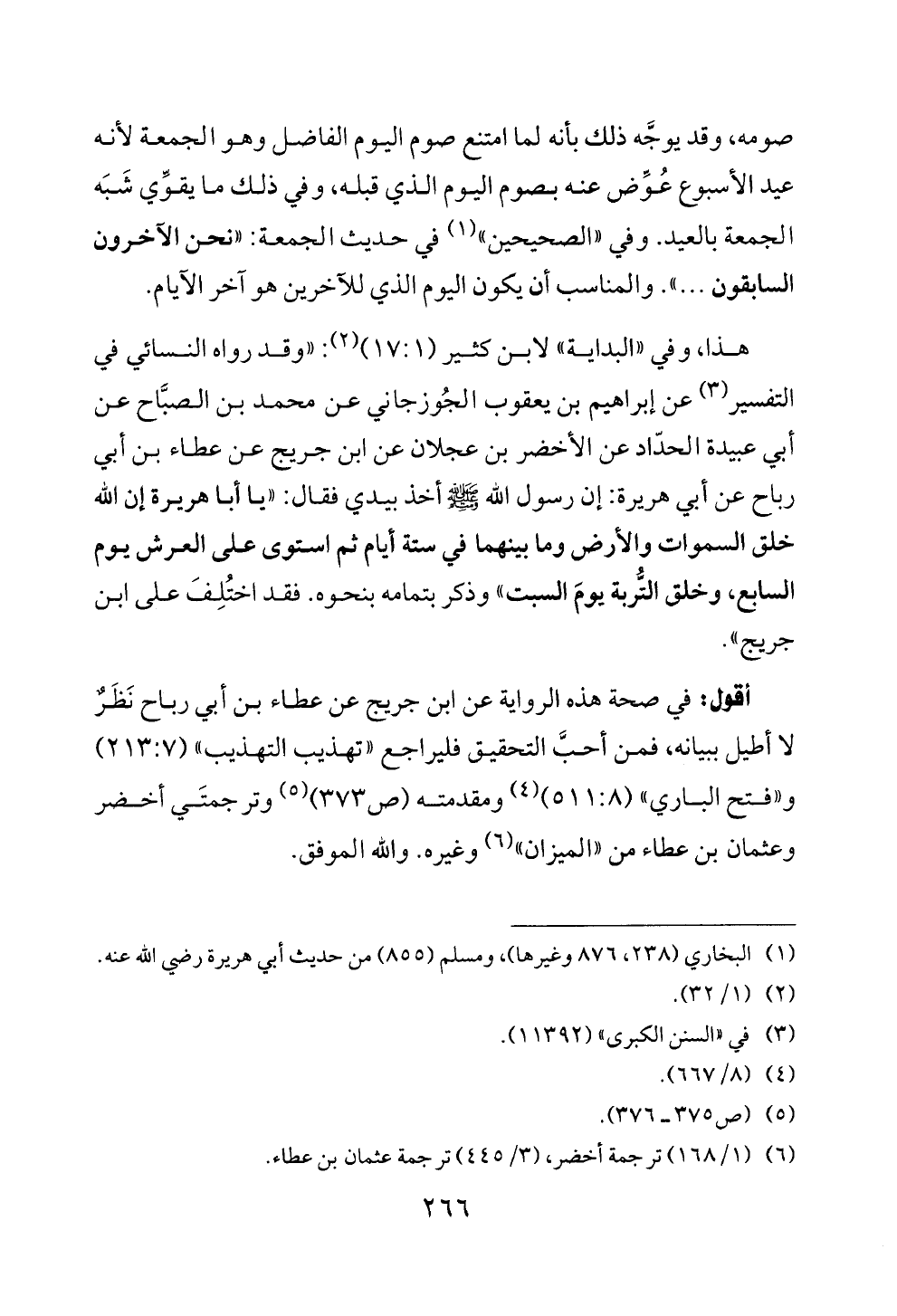 هذا، وفي «البداية» لابن كثير (١٧: ١) (¬٢): «وقد رواه النسائي في التفسير (¬٣) عن إبراهيم بن يعقوب الجُوزجاني عن محمد بن الصبَّاح عن أبي عبيدة الحدّاد عن الأخضر بن عجلان عن ابن جريج عن عطاء بن أبي رباح عن أبي هريرة: إن رسول الله - صلى الله عليه وسلم - أخذ بيدي فقال: «يا أبا هريرة إن الله خلق السموات والأرض وما بينهما في ستة أيام ثم استوى على العرش يوم السابع، وخلق التُّربة يومَ السبت» وذكر بتمامه بنحوه. فقد اختُلِفَ على ابن جريج».
