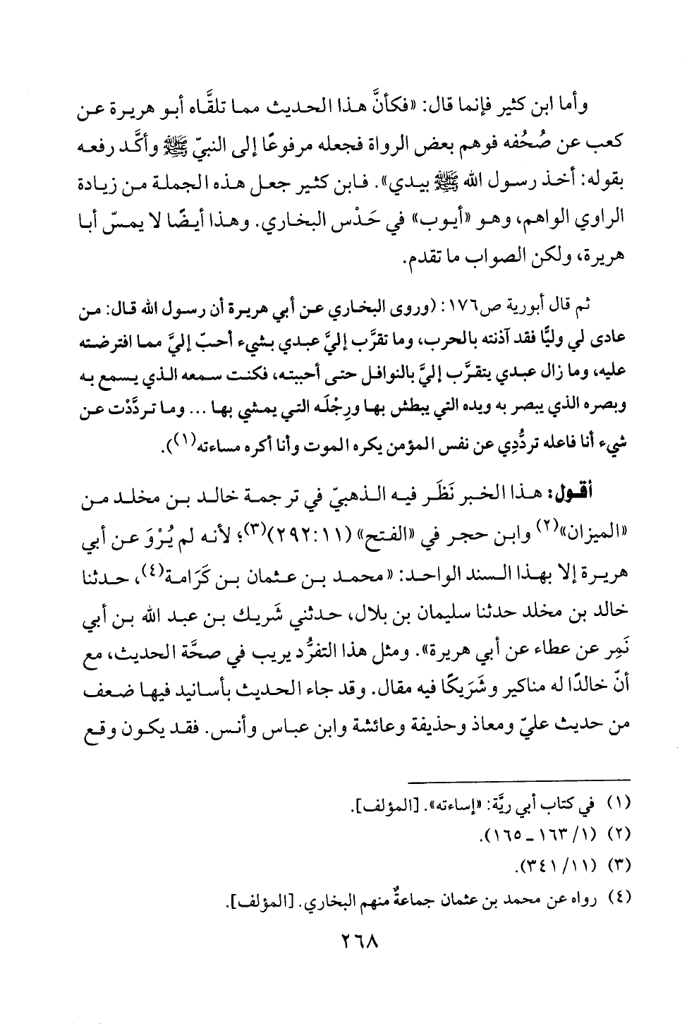 وأما ابن كثير فإنما قال: «فكأنَّ هذا الحديث مما تلقَّاه أبو هريرة عن كعب عن صُحُفه فوهم بعض الرواة فجعله مرفوعًا إلى النبيّ - صلى الله عليه وسلم - وأكَّد رفعه بقوله: أخذ رسول الله - صلى الله عليه وسلم - بيدي». فابن كثير جعل هذه الجملة من زيادة الراوي الواهم، وهو «أيوب» في حَدْس البخاري. وهذا أيضًا لا يمسّ أبا هريرة، ولكن الصواب ما تقدم.