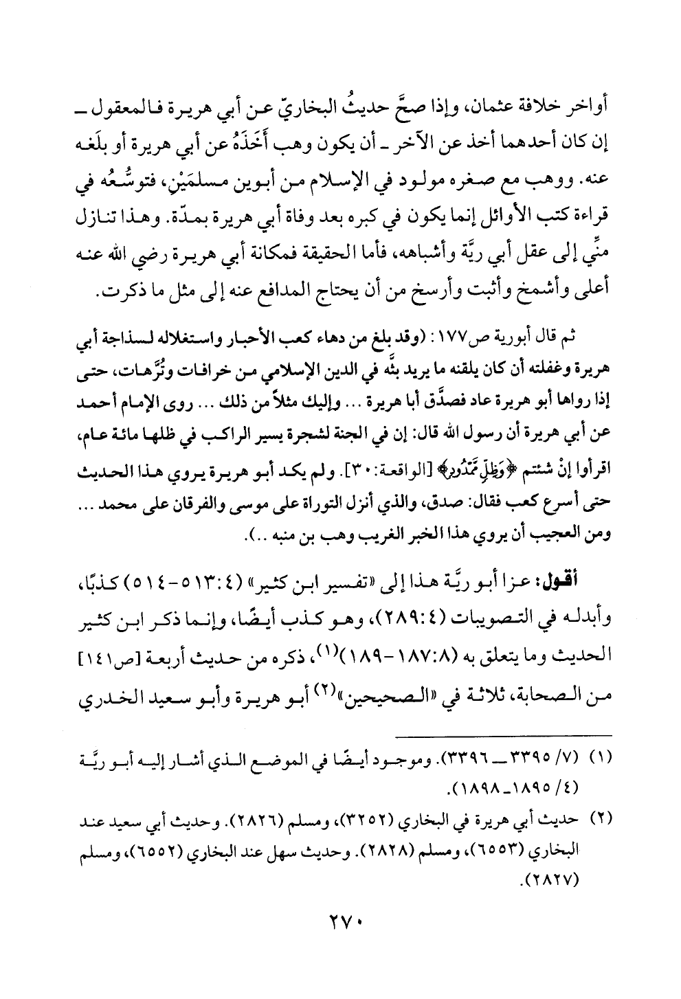 أواخر خلافة عثمان، وإذا صحَّ حديثُ البخاريّ عن أبي هريرة فالمعقول ــ إن كان أحدهما أخذ عن الآخر ــ أن يكون وهب أَخَذَهُ عن أبي هريرة أو بلَغه عنه. ووهب مع صغره مولود في الإسلام من أبوين مسلمَيْنِ، فتوسُّعُه في قراءة كتب الأوائل إنما يكون في كبره بعد وفاة أبي هريرة بمدّة. وهذا تنازل منِّي إلى عقل أبي ريَّة وأشباهه، فأما الحقيقة فمكانة أبي هريرة رضي الله عنه أعلى وأشمخ وأثبت وأرسخ من أن يحتاج المدافع عنه إلى مثل ما ذكرت.