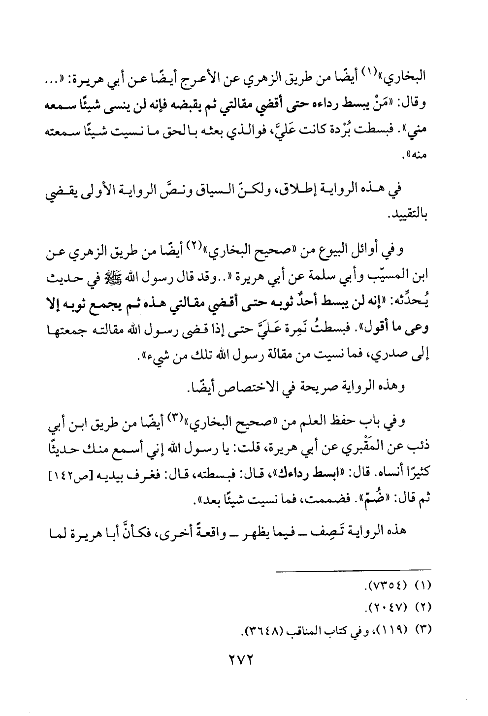وفي أوائل البيوع من «صحيح البخاري» (¬٢) أيضًا من طريق الزهري عن ابن المسيّب وأبي سلمة عن أبي هريرة « .. وقد قال رسول الله - صلى الله عليه وسلم - في حديث يُحدِّثه: «إنه لن يبسط أحدٌ ثوبه حتى أقضي مقالتي هذه ثم يجمع ثوبه إلا وعى ما أقول». فبسطتُ نَمِرة عَلَيَّ حتى إذا قضى رسول الله مقالته جمعتها إلى صدري، فما نسيت من مقالة رسول الله تلك من شيء».