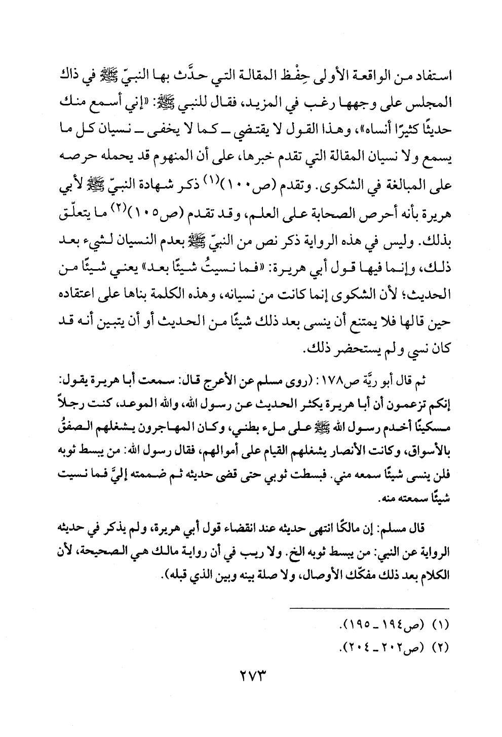 ثم قال أبو ريَّة ص ١٧٨: (روى مسلم عن الأعرج قال: سمعت أبا هريرة يقول: إنكم تزعمون أن أبا هريرة يكثر الحديث عن رسول الله، والله الموعد، كنت رجلاً مسكينًا أخدم رسول الله - صلى الله عليه وسلم - على ملء بطني، وكان المهاجرون يشغلهم الصفقُ بالأسواق، وكانت الأنصار يشغلهم القيام على أموالهم، فقال رسول الله: من يبسط ثوبه فلن ينسى شيئًا سمعه مني. فبسطت ثوبي حتى قضى حديثه ثم ضممته إليَّ فما نسيت شيئًا سمعته منه.