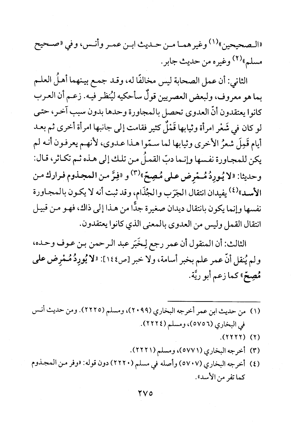 الثالث: أن المنقول أن عمر رجع لِخَبَر عبد الرحمن بن عوف وحده، ولم يُنقل أنّ عمر علم بخبر أسامة، ولا خبر [ص ١٤٤]: «لا يُورِدُ مُمْرِض على مُصِحّ» كما زعم أبو ريَّة.
