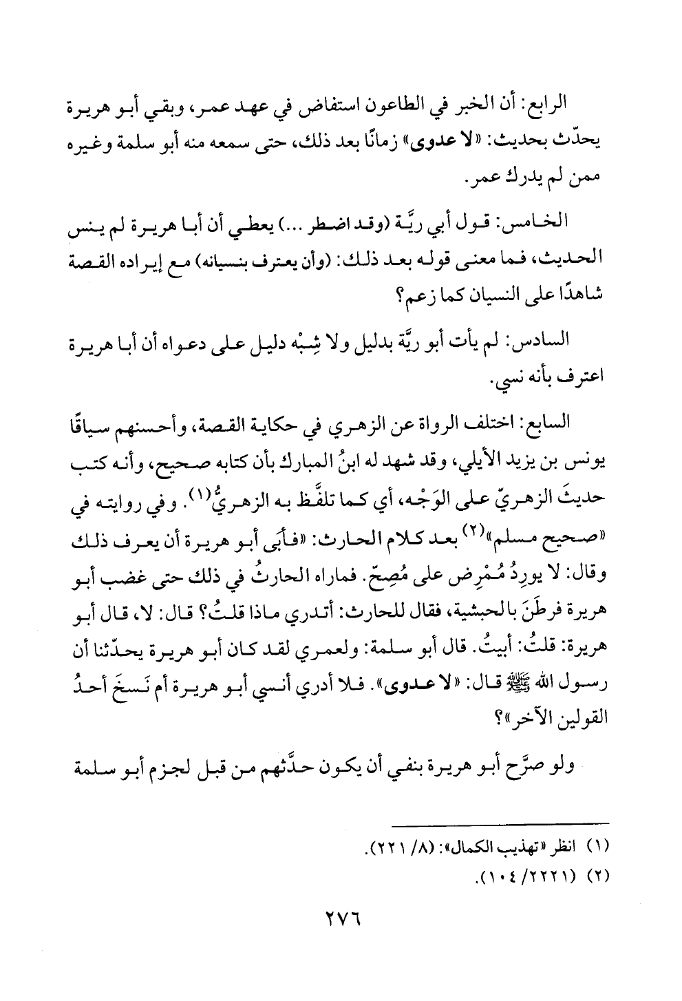 الرابع: أن الخبر في الطاعون استفاض في عهد عمر، وبقي أبو هريرة يحدّث بحديث: «لا عدوى» زمانًا بعد ذلك، حتى سمعه منه أبو سلمة وغيره ممن لم يدرك عمر.