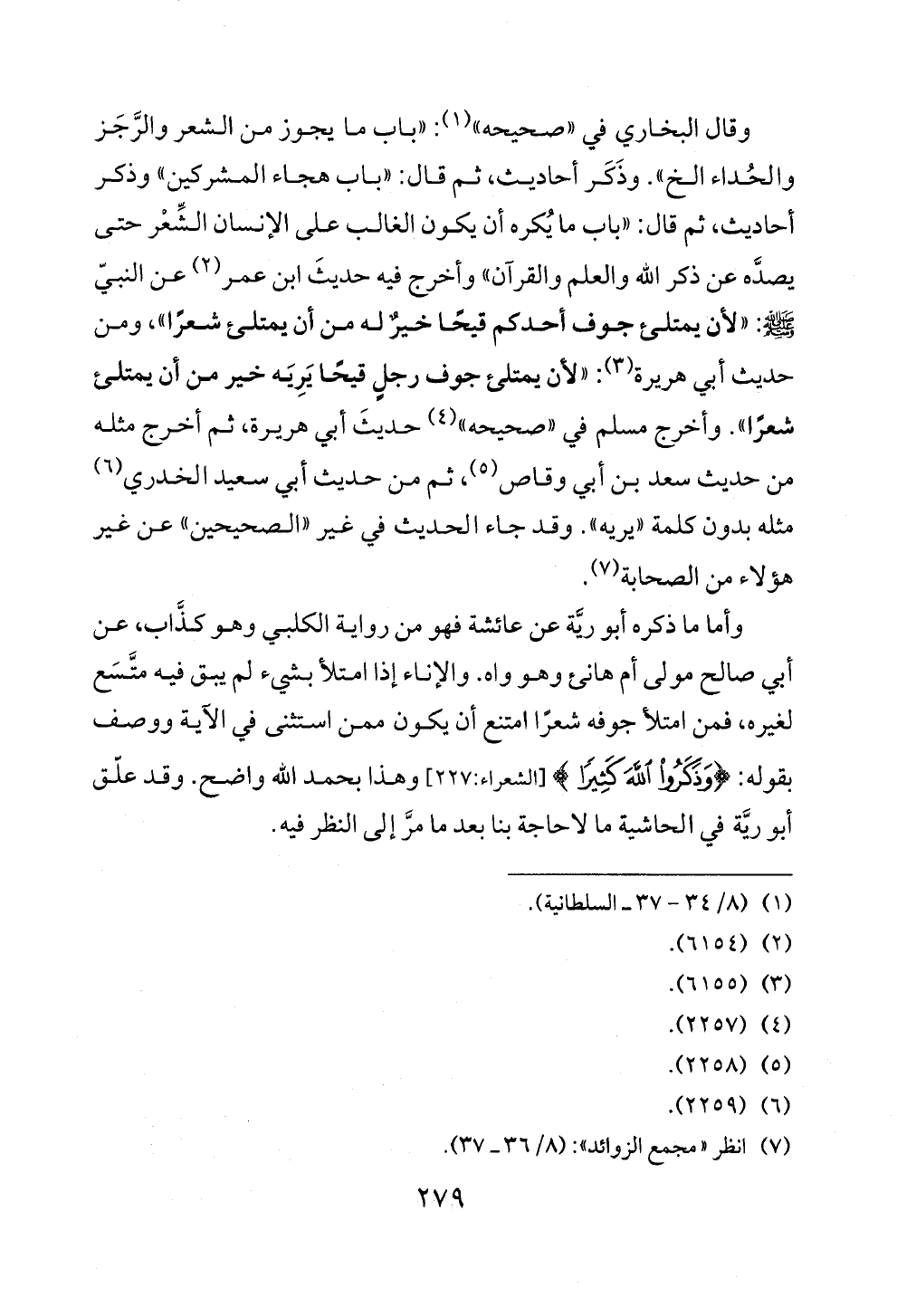 وأما ما ذكره أبو ريَّة عن عائشة فهو من رواية الكلبي وهو كذَّاب، عن أبي صالح مولى أم هانئ وهو واه. والإناء إذا امتلأ بشيء لم يبق فيه متَّسَع لغيره، فمن امتلأ جوفه شعرًا امتنع أن يكون ممن استثنى في الآية ووصف بقوله: {وَذَكَرُوا اللَّهَ كَثِيرًا} [الشعراء: ٢٢٧] وهذا بحمد الله واضح. وقد علّق أبو ريَّة في الحاشية ما لاحاجة بنا بعد ما مرَّ إلى النظر فيه.