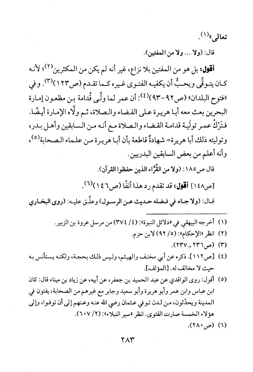 أقول: بل هو من المفتين بلا نزاع، غير أنه لم يكن من المكثرين (¬٢)؛ لأنه كان يتوقَّى ويحبُّ أن يكفيه الفتوى غيره كما تقدم (ص ١٢٣) (¬٣). وفي «فتوح البلدان» (ص ٩٢ - ٩٣) (¬٤): أن عمر لما ولَّى قُدامة بن مظعون إمارة البحرين بعث معه أبا هريرة على القضاء والصلاة، ثم ولَّاه الإمارة أيضًا. فتَرْكُ عمر تولَية قدامة القضاء والصلاة مع أنه من السابقين وأهل بدر، وتوليته ذلك أبا هريرة= شهادةٌ قاطعة بأن أبا هريرة من علماء الصحابة (¬٥)، وأنه أعلم من بعض السابقين البدريين.