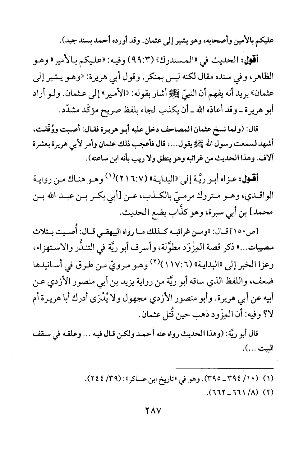 أقول: الحديث في «المستدرك» (٩٩: ٣) وفيه: «عليكم بالأمير» وهو الظاهر، وفي سنده مقال لكنه ليس بمنكر. وقول أبي هريرة: «وهو يشير إلى عثمان» يريد أنه يفهم أن النبيّ - صلى الله عليه وسلم - أشار بقوله: «الأمير» إلى عثمان. ولو أراد أبو هريرة ــ وقد أعاذه الله ــ أن يكذب لجاء بلفظ صريح مؤكّد مشدّد.