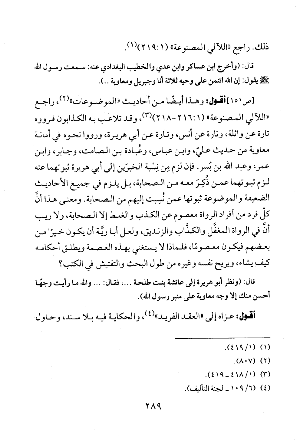 [ص ١٥١] أقول: وهذا أيضًا من أحاديث «الموضوعات» (¬٢)، راجع «اللآلي المصنوعة» (٢١٦: ١ - ٢١٨) (¬٣)، وقد تلاعب به الكذابون فرووه تارة عن واثلة، وتارة عن أنس، وتارة عن أبي هريرة، ورووا نحوه في أمانة معاوية من حديث عليّ، وابن عباس، وعُبادة بن الصامت، وجابر، وابن عمر، وعبد الله بن بُسر. فإن لزم مِن نِسْبة الخبرَين إلى أبي هريرة ثبوتهما عنه لزم ثبوتهما عمن ذُكِرَ معه من الصحابة، بل يلزم في جميع الأحاديث الضعيفة والموضوعة ثبوتها عمن نُسِبت إليهم من الصحابة. ومعنى هذا أنَّ كلّ فرد من أفراد الرواة معصوم عن الكذب والغلط إلا الصحابة، ولا ريب أنَّ في الرواة المغفَّل والكذَّاب والزنديق، ولعل أبا ريَّة أن يكون خيرًا من بعضهم فيكون معصومًا، فلماذا لا يستغني بهذه العصمة ويطلق أحكامه كيف يشاء، ويريح نفسه وغيره من طول البحث والتفتيش في الكتب؟