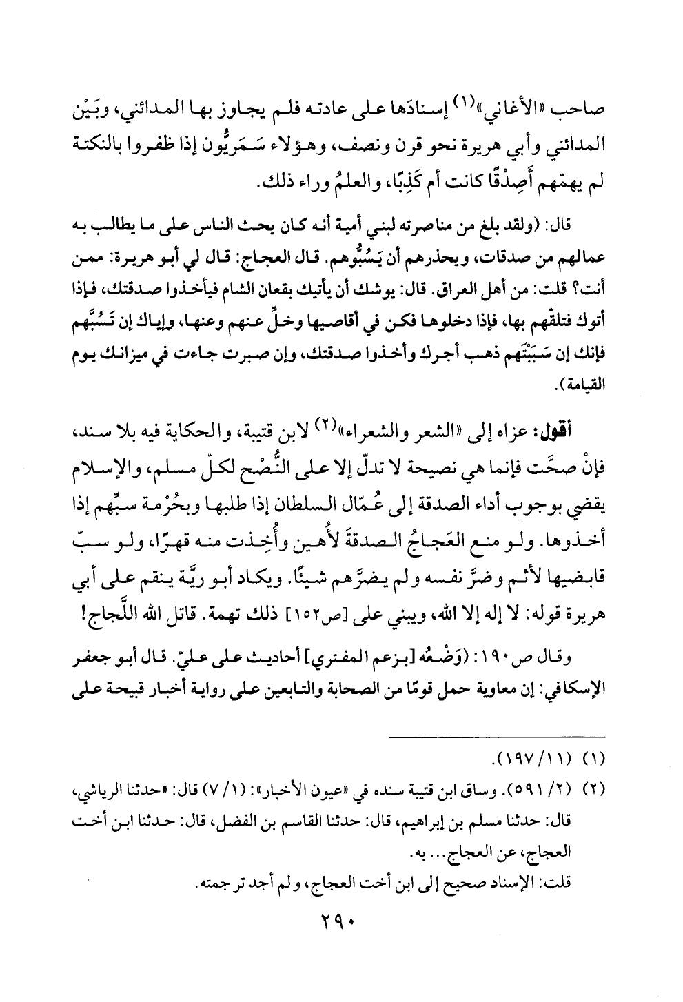 أقول: عزاه إلى «الشعر والشعراء» (¬٢) لابن قتيبة، والحكاية فيه بلا سند، فإنْ صحَّت فإنما هي نصيحة لا تدلّ إلا على النُّصْح لكلّ مسلم، والإسلام يقضي بوجوب أداء الصدقة إلى عُمّال السلطان إذا طلبها وبحُرْمة سبِّهم إذا أخذوها. ولو منع العَجاجُ الصدقةَ لأُهين وأُخِذت منه قهرًا، ولو سبّ قابضيها لأثم وضرَّ نفسه ولم يضرَّهم شيئًا. ويكاد أبو ريَّة ينقم على أبي هريرة قوله: لا إله إلا الله، ويبني على [ص ١٥٢] ذلك تهمة. قاتل الله اللَّجاج!