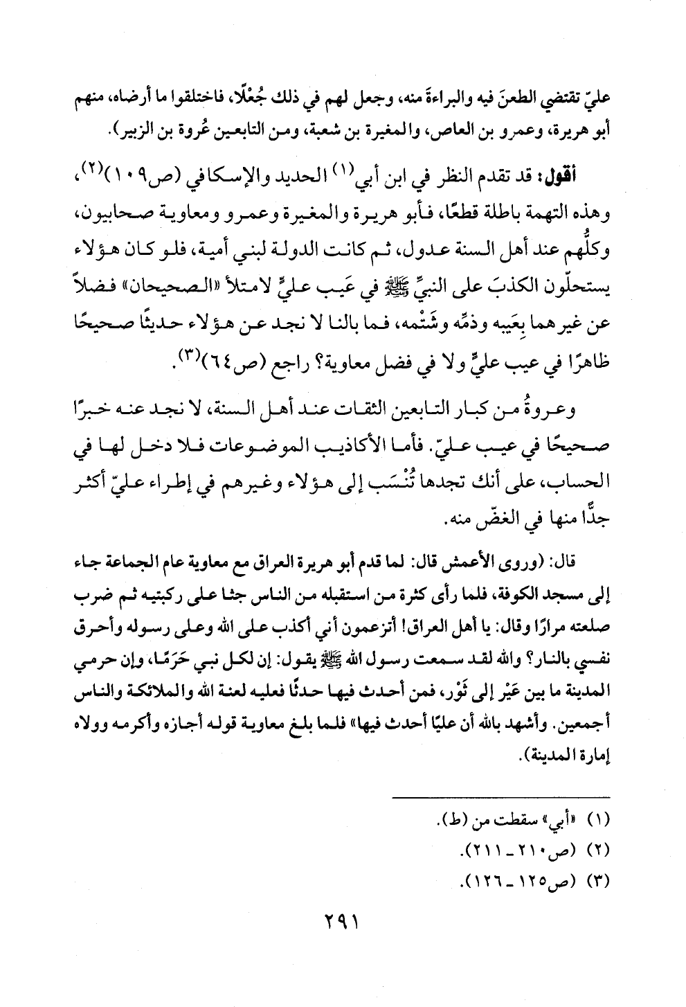 أقول: قد تقدم النظر في ابن أبي (¬١) الحديد والإسكافي (ص ١٠٩) (¬٢)، وهذه التهمة باطلة قطعًا، فأبو هريرة والمغيرة وعمرو ومعاوية صحابيون، وكلُّهم عند أهل السنة عدول، ثم كانت الدولة لبني أمية، فلو كان هؤلاء يستحلّون الكذبَ على النبيِّ - صلى الله عليه وسلم - في عَيب عليٍّ لامتلأ «الصحيحان» فضلاً عن غيرهما بِعَيبه وذمِّه وشَتْمه، فما بالنا لا نجد عن هؤلاء حديثًا صحيحًا ظاهرًا في عيب عليٍّ ولا في فضل معاوية؟ راجع (ص ٦٤) (¬٣).