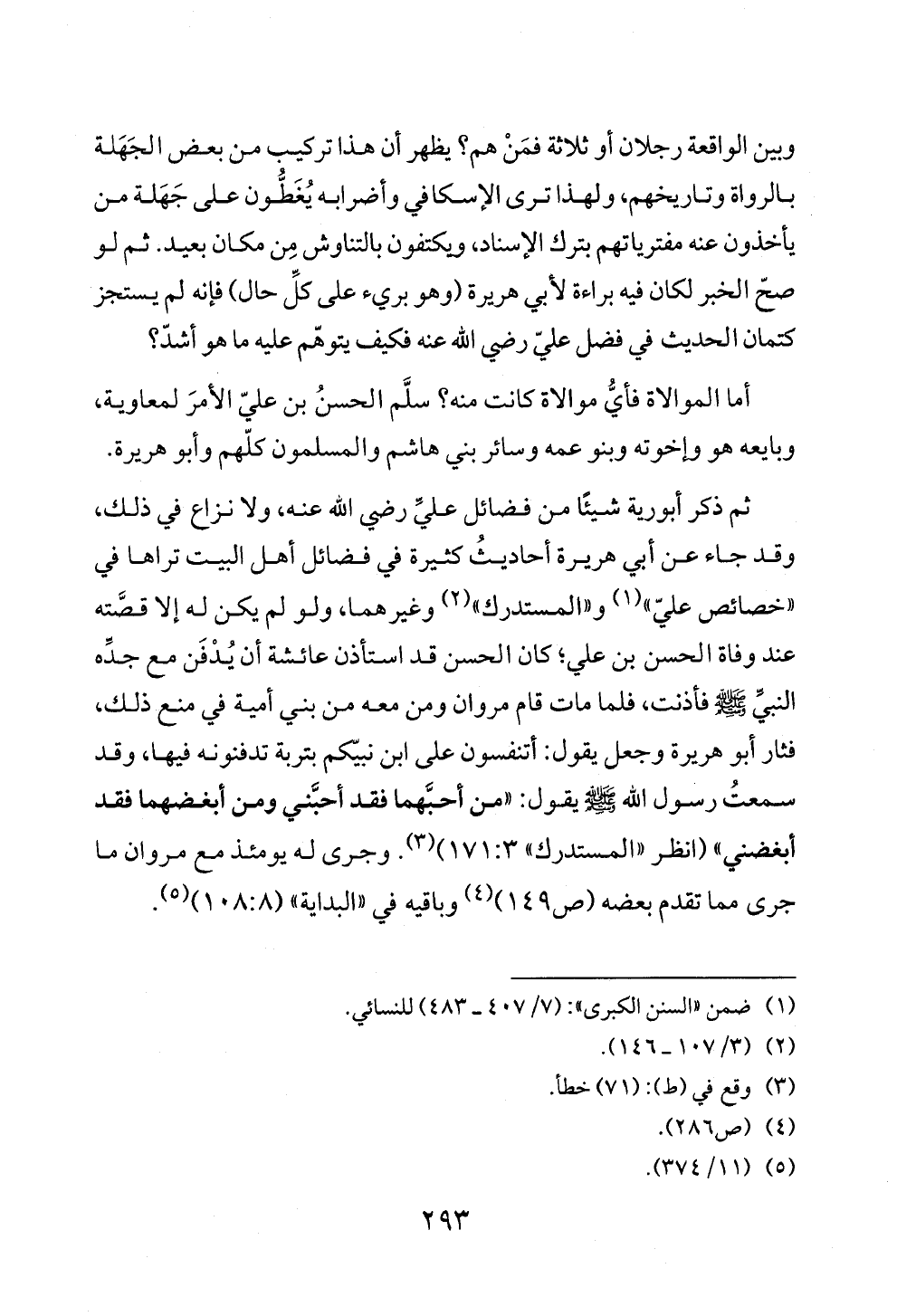 ثم ذكر أبورية شيئًا من فضائل عليِّ رضي الله عنه، ولا نزاع في ذلك، وقد جاء عن أبي هريرة أحاديثُ كثيرة في فضائل أهل البيت تراها في «خصائص عليّ» (¬١) و «المستدرك» (¬٢) وغيرهما، ولو لم يكن له إلا قصَّته عند وفاة الحسن بن علي؛ كان الحسن قد استأذن عائشة أن يُدْفَن مع جدِّه النبيِّ - صلى الله عليه وسلم - فأذنت، فلما مات قام مروان ومن معه من بني أمية في منع ذلك، فثار أبو هريرة وجعل يقول: أتنفسون على ابن نبيّكم بتربة تدفنونه فيها، وقد سمعتُ رسول الله - صلى الله عليه وسلم - يقول: «من أحبَّهما فقد أحبَّني ومن أبغضهما فقد أبغضني» (انظر «المستدرك» ١٧١: ٣) (¬٣). وجرى له يومئذ مع مروان ما جرى مما تقدم بعضه (ص ١٤٩) (¬٤) وباقيه في «البداية» (١٠٨: ٨) (¬٥).