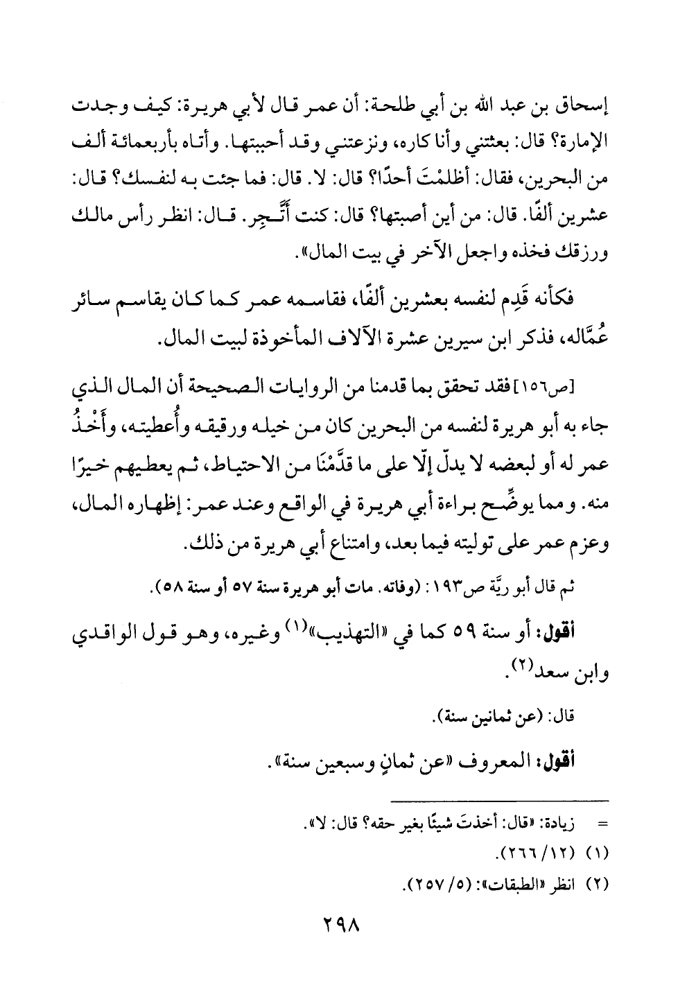 [ص ١٥٦] فقد تحقق بما قدمنا من الروايات الصحيحة أن المال الذي جاء به أبو هريرة لنفسه من البحرين كان من خيله ورقيقه وأعطيته، وأَخْذُ عمر له أو لبعضه لا يدلّ إلّا على ما قدَّمْنَا من الاحتياط، ثم يعطيهم خيرًا منه. ومما يوضِّح براءة أبي هريرة في الواقع وعند عمر: إظهاره المال، وعزم عمر على توليته فيما بعد، وامتناع أبي هريرة من ذلك.