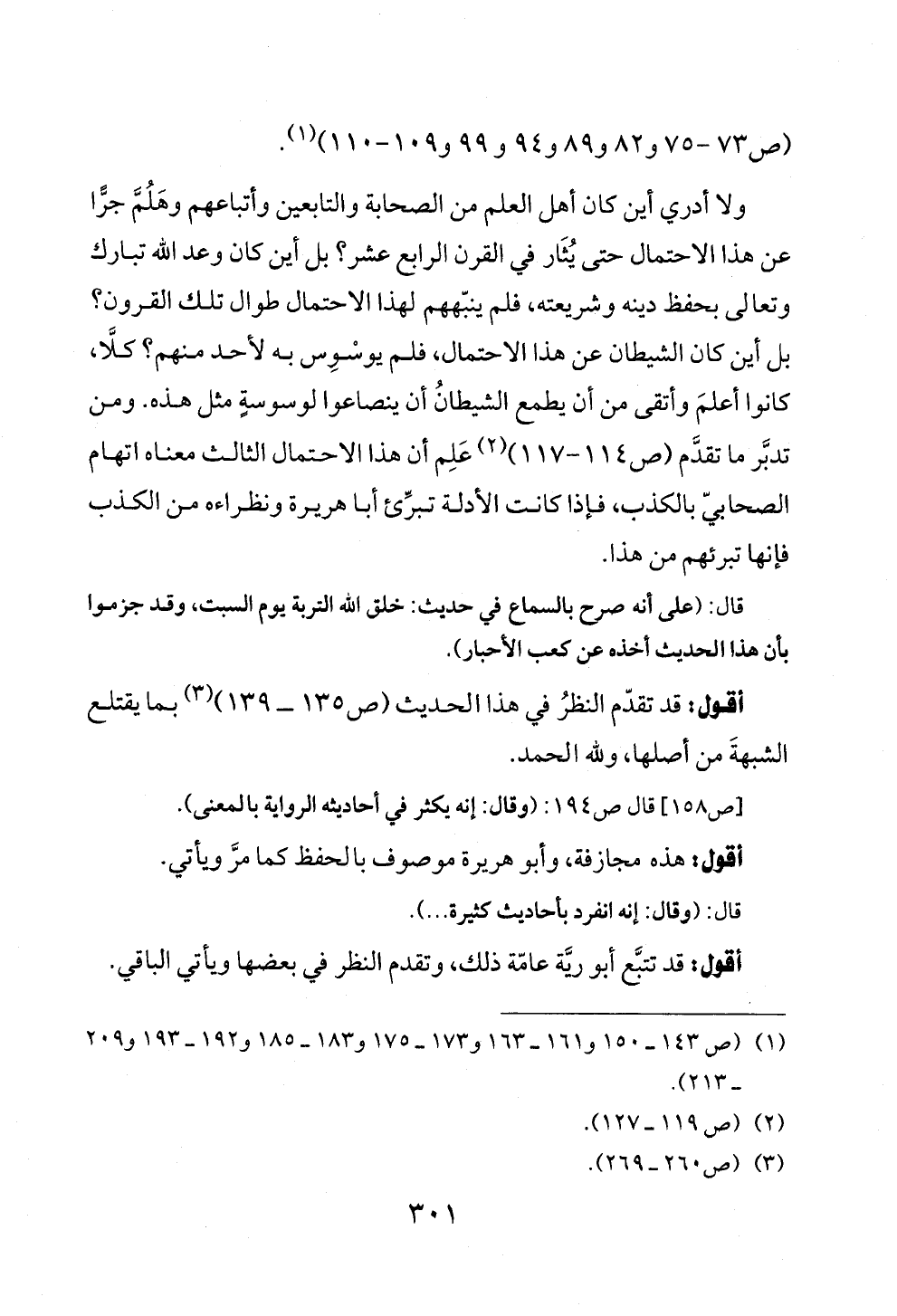 ولا أدري أين كان أهل العلم من الصحابة والتابعين وأتباعهم وهَلُمَّ جرًّا عن هذا الاحتمال حتى يُثَار في القرن الرابع عشر؟ بل أين كان وعد الله تبارك وتعالى بحفظ دينه وشريعته، فلم ينبّههم لهذا الاحتمال طوال تلك القرون؟ بل أين كان الشيطان عن هذا الاحتمال، فلم يوسْوِس به لأحد منهم؟ كلَّا، كانوا أعلمَ وأتقى من أن يطمع الشيطانُ أن ينصاعوا لوسوسةٍ مثل هذه. ومن تدبَّر ما تقدَّم (ص ١١٤ - ١١٧) (¬٢) عَلِم أن هذا الاحتمال الثالث معناه اتهام الصحابيّ بالكذب، فإذا كانت الأدلة تبرِّئ أبا هريرة ونظراءه من الكذب فإنها تبرئهم من هذا.
