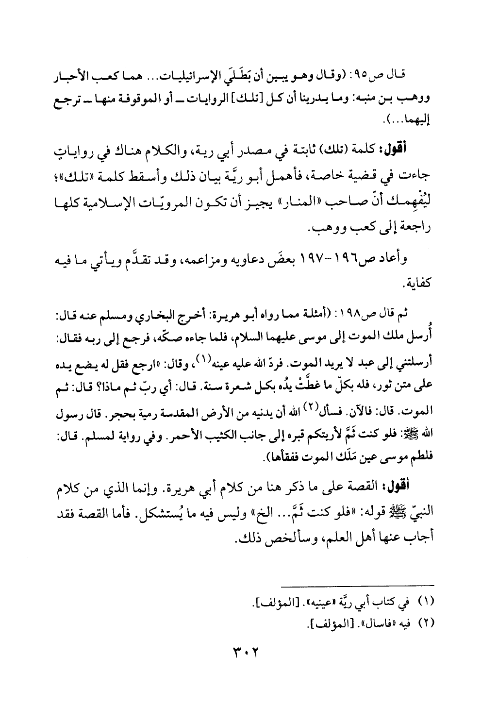 أقول: كلمة (تلك) ثابتة في مصدر أبي رية، والكلام هناك في رواياتٍ جاءت في قضية خاصة، فأهمل أبو ريَّة بيان ذلك وأسقط كلمة «تلك»؛ ليُفْهِمك أنّ صاحب «المنار» يجيز أن تكون المرويّات الإسلامية كلها راجعة إلى كعب ووهب.