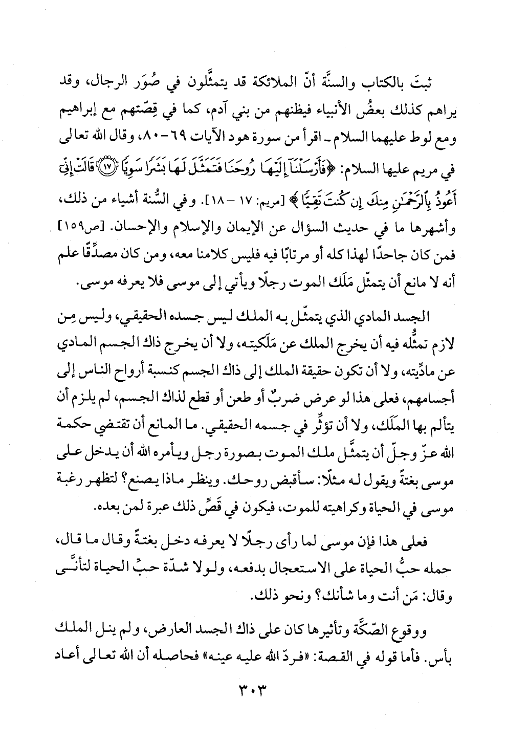 ثبتَ بالكتاب والسنَّة أنّ الملائكة قد يتمثَّلون في صُوَر الرجال، وقد يراهم كذلك بعضُ الأنبياء فيظنهم من بني آدم، كما في قِصّتهم مع إبراهيم ومع لوط عليهما السلام ــ اقرأ من سورة هود الآيات ٦٩ - ٨٠، وقال الله تعالى في مريم عليها السلام: {فَأَرْسَلْنَا إِلَيْهَا رُوحَنَا فَتَمَثَّلَ لَهَا بَشَرًا سَوِيًّا (١٧) قَالَتْ إِنِّي أَعُوذُ بِالرَّحْمَنِ مِنْكَ إِنْ كُنْتَ تَقِيًّا} [مريم: ١٧ - ١٨]. وفي السُّنة أشياء من ذلك، وأشهرها ما في حديث السؤال عن الإيمان والإسلام والإحسان. [ص ١٥٩] فمن كان جاحدًا لهذا كله أو مرتابًا فيه فليس كلامنا معه، ومن كان مصدِّقًا علم أنه لا مانع أن يتمثّل مَلَك الموت رجلًا ويأتي إلى موسى فلا يعرفه موسى.